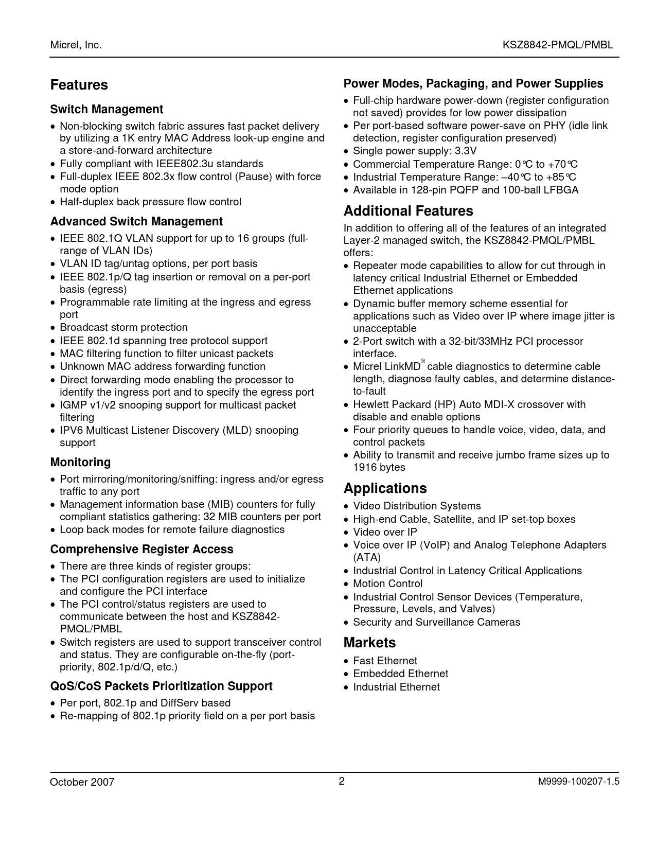 Micrel, Inc. Features Switch Management • Non-blocking switch fabric assures fast packet delivery by utilizing a 1K entry MAC Address look-up engine and a store-and-forward architecture • Fully compliant with IEEE802.3u standards • Full-duplex IEEE 802.3x flow control (Pause) with force mode option • Half-duplex back pressure flow control Advanced Switch Management • IEEE 802.1Q VLAN support for up to 16 groups (fullrange of VLAN IDs) • VLAN ID tag/untag options, per port basis • IEEE 802.1p/Q tag insertion or removal on a per-port basis (egress) • Programmable rate limiting at the ingress and egress port • Broadcast storm protection • IEEE 802.1d spanning tree protocol support • MAC filtering function to filter unicast packets • Unknown MAC address forwarding function • Direct forwarding mode enabling the processor to identify the ingress port and to specify the egress port • IGMP v1/v2 snooping support for multicast packet filtering • IPV6 Multicast Listener Discovery (MLD) snooping support Monitoring • Port mirroring/monitoring/sniffing: ingress and/or egress traffic to any port • Management information base (MIB) counters for fully compliant statistics gathering: 32 MIB counters per port • Loop back modes for remote failure diagnostics Comprehensive Register Access • There are three kinds of register groups: • The PCI configuration registers are used to initialize and configure the PCI interface • The PCI control/status registers are used to communicate between the host and KSZ8842PMQL/PMBL • Switch registers are used to support transceiver control and status. They are configurable on-the-fly (portpriority, 802.1p/d/Q, etc.) QoS/CoS Packets Prioritization Support KSZ8842-PMQL/PMBL Power Modes, Packaging, and Power Supplies • Full-chip hardware power-down (register configuration not saved) provides for low power dissipation • Per port-based software power-save on PHY (idle link detection, register configuration preserved) • Single power supply: 3.3V • Commercial Temperature Range: 0°C to +70°C • Industrial Temperature Range: –40°C to +85°C • Available in 128-pin PQFP and 100-ball LFBGA Additional Features In addition to offering all of the features of an integrated Layer-2 managed switch, the KSZ8842-PMQL/PMBL offers: • Repeater mode capabilities to allow for cut through in latency critical Industrial Ethernet or Embedded Ethernet applications • Dynamic buffer memory scheme essential for applications such as Video over IP where image jitter is unacceptable • 2-Port switch with a 32-bit/33MHz PCI processor interface. ® • Micrel LinkMD cable diagnostics to determine cable length, diagnose faulty cables, and determine distanceto-fault • Hewlett Packard (HP) Auto MDI-X crossover with disable and enable options • Four priority queues to handle voice, video, data, and control packets • Ability to transmit and receive jumbo frame sizes up to 1916 bytes Applications • • • • • • • • Video Distribution Systems High-end Cable, Satellite, and IP set-top boxes Video over IP Voice over IP (VoIP) and Analog Telephone Adapters (ATA) Industrial Control in Latency Critical Applications Motion Control Industrial Control Sensor Devices (Temperature, Pressure, Levels, and Valves) Security and Surveillance Cameras Markets • Fast Ethernet • Embedded Ethernet • Industrial Ethernet • Per port, 802.1p and DiffServ based • Re-mapping of 802.1p priority field on a per port basis October 2007 2 M9999-100207-1.5