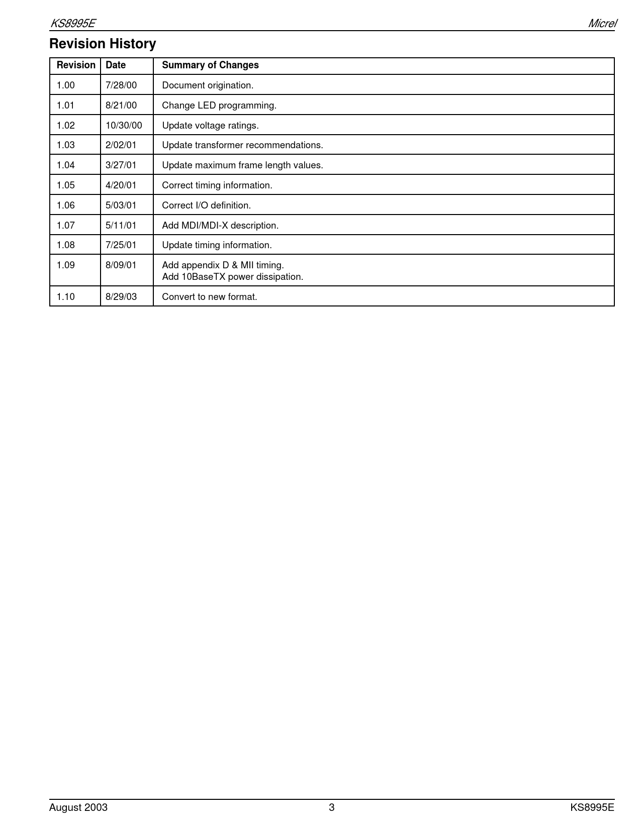 | Pages / Page | 41 / 3 — KS8995E Micrel Revision History |