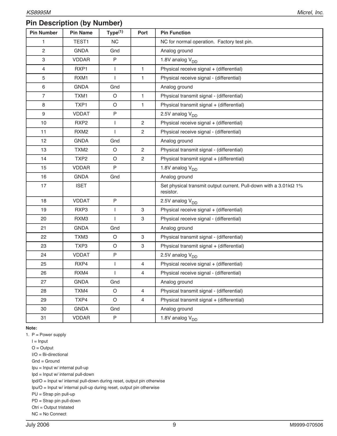 KS8995M Micrel, Inc. Pin Description (by Number)