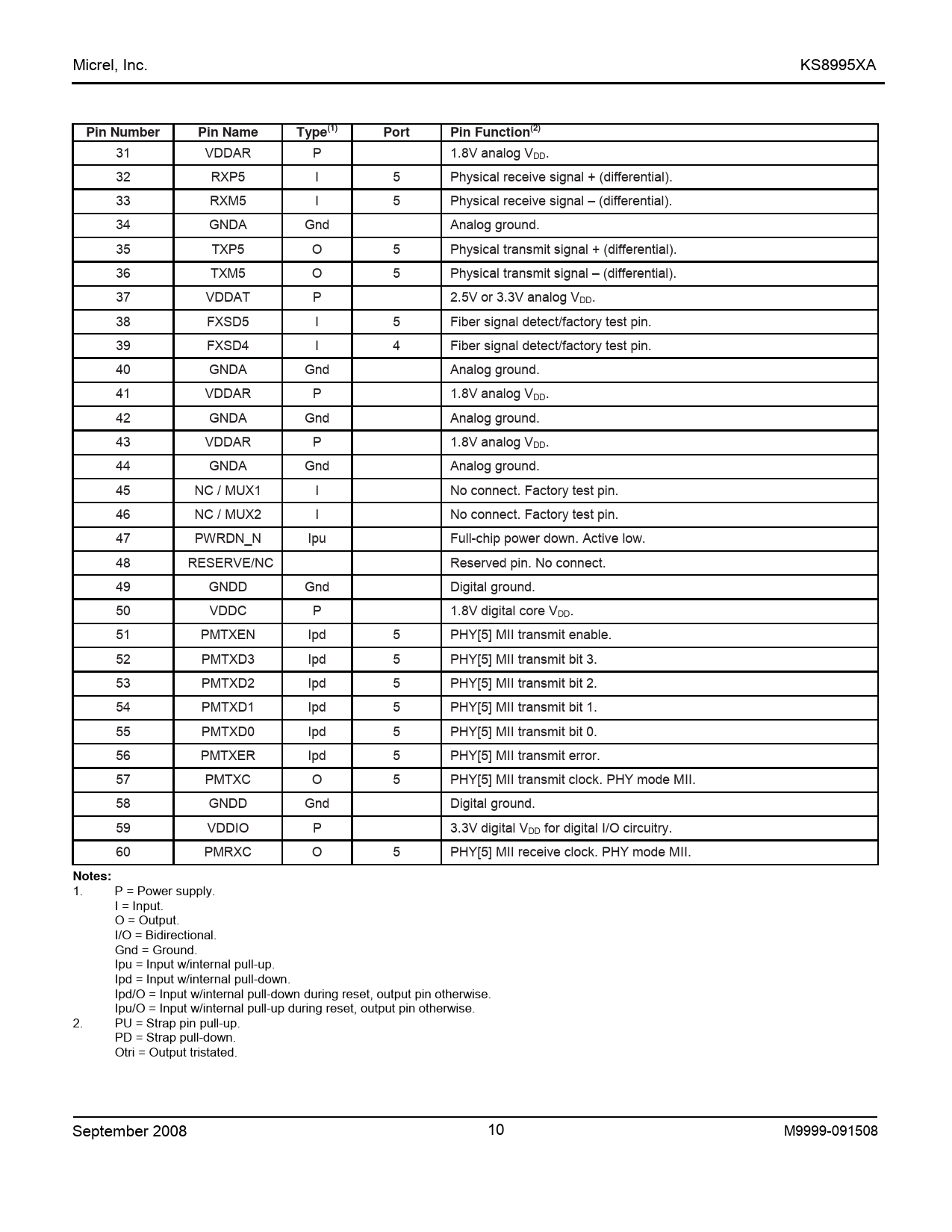 Micrel, Inc. KS8995XA Pin Number Pin Name Type(1) 31 VDDAR P 32 RXP5 I 5 Physical receive signal + (differential). 5 Physical receive signal – (differential). Port Pin Function(2) 1.8V analog VDD. 33 RXM5 I 34 GNDA Gnd 35 TXP5 O 5 Physical transmit signal + (differential). 36 TXM5 O 5 Physical transmit signal – (differential). 37 VDDAT P 38 FXSD5 I 5 Fiber signal detect/factory test pin. 39 FXSD4 I 4 Fiber signal detect/factory test pin. 40 GNDA Gnd 41 VDDAR P 42 GNDA Gnd 43 VDDAR P 44 GNDA Gnd 45 NC / MUX1 I No connect. Factory test pin. 46 NC / MUX2 I No connect. Factory test pin. 47 PWRDN_N Ipu 48 RESERVE/NC 49 GNDD Gnd 50 VDDC P 51 PMTXEN Ipd 5 PHY[5] MII transmit enable. 52 PMTXD3 Ipd 5 PHY[5] MII transmit bit 3. 53 PMTXD2 Ipd 5 PHY[5] MII transmit bit 2. 54 PMTXD1 Ipd 5 PHY[5] MII transmit bit 1. 55 PMTXD0 Ipd 5 PHY[5] MII transmit bit 0. 56 PMTXER Ipd 5 PHY[5] MII transmit error. 57 PMTXC O 5 PHY[5] MII transmit clock. PHY mode MII. 58 GNDD Gnd 59 VDDIO P 60 PMRXC O Analog ground. 2.5V or 3.3V analog VDD. Analog ground. 1.8V analog VDD. Analog ground. 1.8V analog VDD. Analog ground. Full-chip power down. Active low. Reserved pin. No connect. Digital ground. 1.8V digital core VDD. Digital ground. 3.3V digital VDD for digital I/O circuitry. 5 PHY[5] MII receive clock. PHY mode MII. Notes: 1. P = Power supply. I = Input. O = Output. I/O = Bidirectional. Gnd = Ground. Ipu = Input w/internal pull-up. Ipd = Input w/internal pull-down. Ipd/O = Input w/internal pull-down during reset, output pin otherwise. Ipu/O = Input w/internal pull-up during reset, output pin otherwise. 2. PU = Strap pin pull-up. PD = Strap pull-down. Otri = Output tristated. September 2008 10 M9999-091508