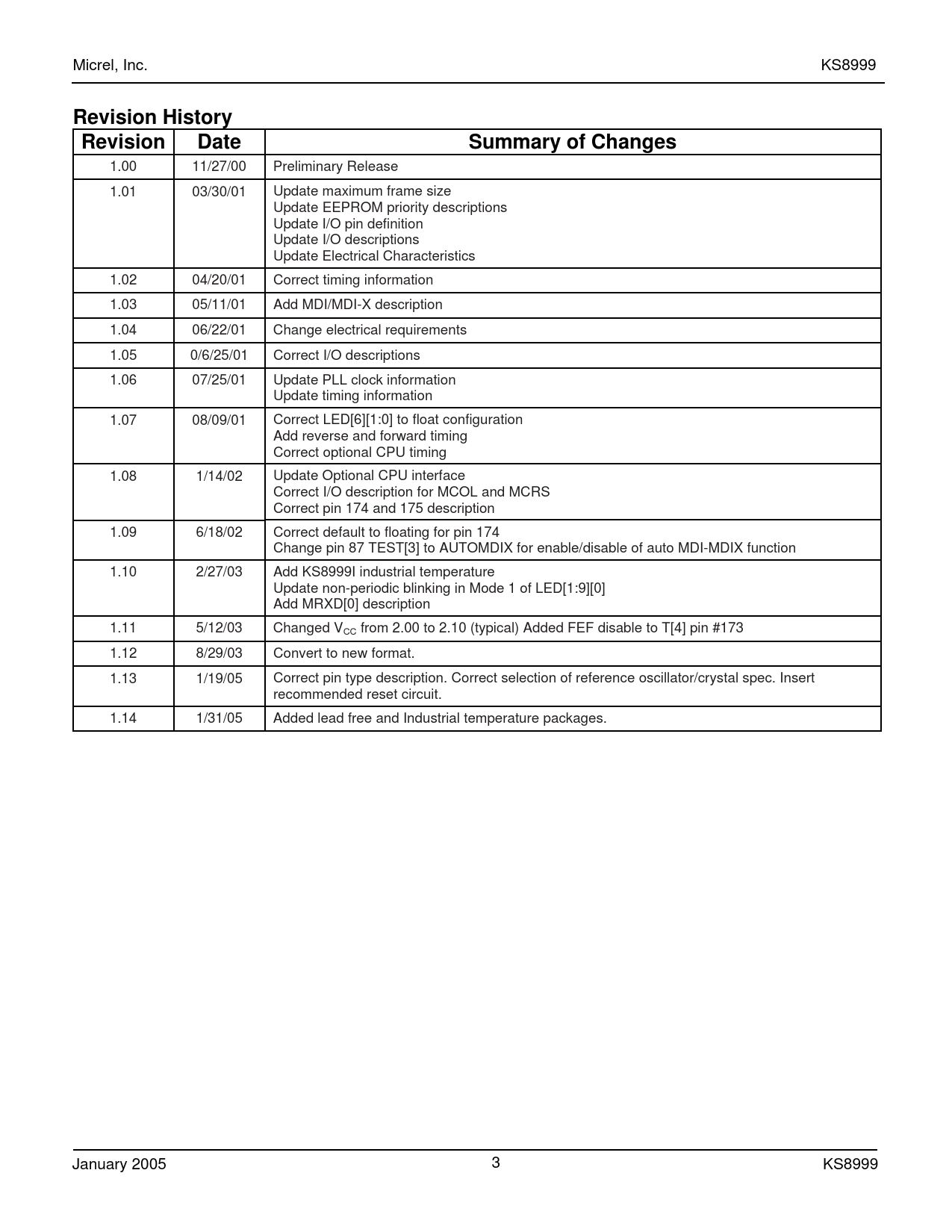 | Pages / Page | 53 / 3 — Micrel, Inc. KS8999 Revision History. Revision |