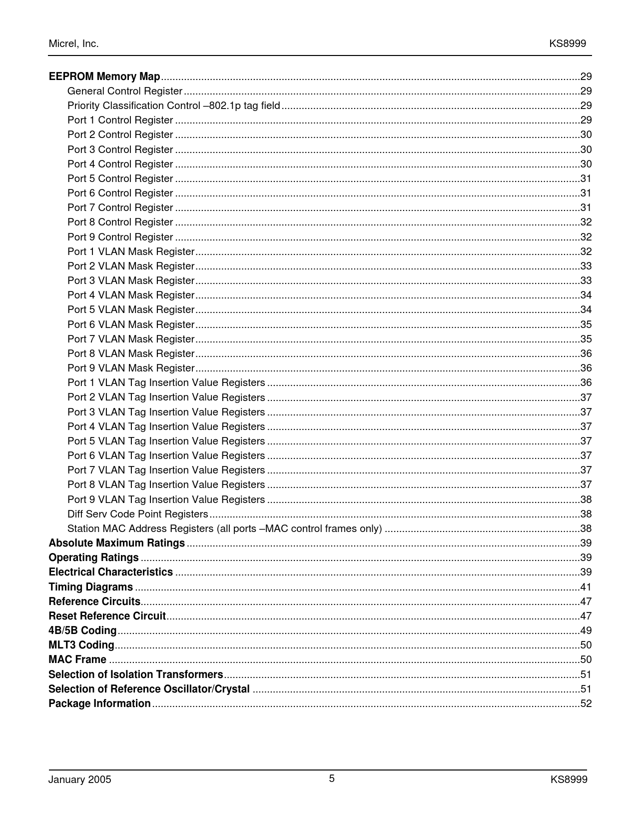 Micrel, Inc. KS8999 EEPROM Memory Map.29 General Control Register .29 Priority Classification Control –802.1p tag field .29 Port 1 Control Register .29 Port 2 Control Register .30 Port 3 Control Register .30 Port 4 Control Register .30 Port 5 Control Register .31 Port 6 Control Register .31 Port 7 Control Register .31 Port 8 Control Register .32 Port 9 Control Register .32 Port 1 VLAN Mask Register.32 Port 2 VLAN Mask Register.33 Port 3 VLAN Mask Register.33 Port 4 VLAN Mask Register.34 Port 5 VLAN Mask Register.34 Port 6 VLAN Mask Register.35 Port 7 VLAN Mask Register.35 Port 8 VLAN Mask Register.36 Port 9 VLAN Mask Register.36 Port 1 VLAN Tag Insertion Value Registers .36 Port 2 VLAN Tag Insertion Value Registers .37 Port 3 VLAN Tag Insertion Value Registers .37 Port 4 VLAN Tag Insertion Value Registers .37 Port 5 VLAN Tag Insertion Value Registers .37 Port 6 VLAN Tag Insertion Value Registers .37 Port 7 VLAN Tag Insertion Value Registers .37 Port 8 VLAN Tag Insertion Value Registers .37 Port 9 VLAN Tag Insertion Value Registers .38 Diff Serv Code Point Registers .38 Station MAC Address Registers (all ports –MAC control frames only) .38 Absolute Maximum Ratings .39 Operating Ratings .39 Electrical Characteristics .39 Timing Diagrams .41 Reference Circuits.47 Reset Reference Circuit.47 4B/5B Coding.49 MLT3 Coding.50 MAC Frame .50 Selection of Isolation Transformers.51 Selection of Reference Oscillator/Crystal .51 Package Information .52 January 2005 5 KS8999