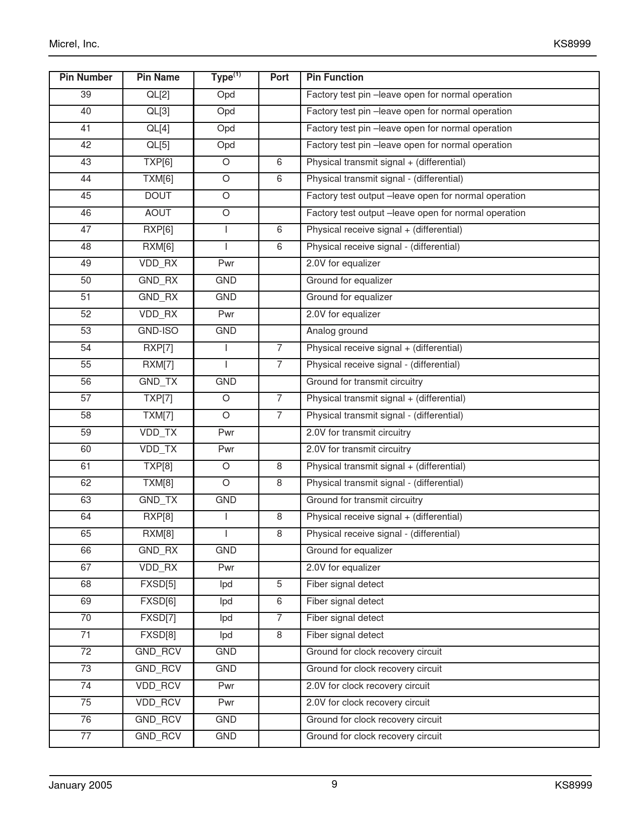 Micrel, Inc. KS8999 Pin Number Pin Name Type(1) 39 QL[2] Opd Factory test pin –leave open for normal operation 40 QL[3] Opd Factory test pin –leave open for normal operation 41 QL[4] Opd Factory test pin –leave open for normal operation 42 QL[5] Opd Factory test pin –leave open for normal operation 43 TXP[6] O 6 Physical transmit signal + (differential) 44 TXM[6] O 6 Physical transmit signal -(differential) 45 DOUT O Factory test output –leave open for normal operation 46 AOUT O Factory test output –leave open for normal operation 47 RXP[6] I 6 Physical receive signal + (differential) 48 RXM[6] I 6 Physical receive signal -(differential) 49 VDD_RX Pwr 2.0V for equalizer 50 GND_RX GND Ground for equalizer 51 GND_RX GND Ground for equalizer 52 VDD_RX Pwr 2.0V for equalizer 53 GND-ISO GND Analog ground 54 RXP[7] I 7 Physical receive signal + (differential) 55 RXM[7] I 7 Physical receive signal -(differential) 56 GND_TX GND 57 TXP[7] O 7 Physical transmit signal + (differential) 58 TXM[7] O 7 Physical transmit signal -(differential) 59 VDD_TX Pwr 2.0V for transmit circuitry 60 VDD_TX Pwr 2.0V for transmit circuitry 61 TXP[8] O 8 Physical transmit signal + (differential) 62 TXM[8] O 8 Physical transmit signal -(differential) 63 GND_TX GND 64 RXP[8] I 8 Physical receive signal + (differential) 65 RXM[8] I 8 Physical receive signal -(differential) 66 GND_RX GND Ground for equalizer 67 VDD_RX Pwr 2.0V for equalizer 68 FXSD[5] Ipd 5 Fiber signal detect 69 FXSD[6] Ipd 6 Fiber signal detect 70 FXSD[7] Ipd 7 Fiber signal detect 71 FXSD[8] Ipd 8 Fiber signal detect 72 GND_RCV GND Ground for clock recovery circuit 73 GND_RCV GND Ground for clock recovery circuit 74 VDD_RCV Pwr 2.0V for clock recovery circuit 75 VDD_RCV Pwr 2.0V for clock recovery circuit 76 GND_RCV GND Ground for clock recovery circuit 77 GND_RCV GND Ground for clock recovery circuit January 2005 Port Pin Function Ground for transmit circuitry Ground for transmit circuitry 9 KS8999