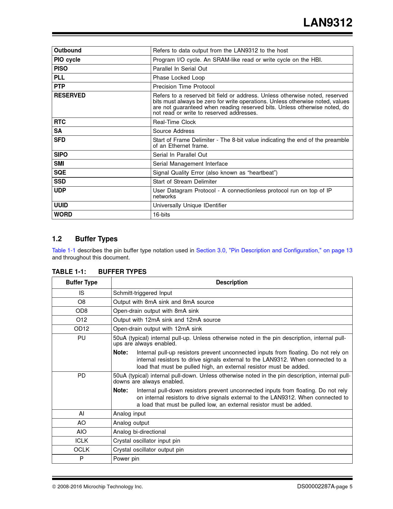 LAN9312. Outbound. PIO cycle. PISO. PLL. PTP. RESERVED. RTC. SFD. SIPO. SMI. SQE. SSD. UDP. UUID. WORD. 1.2. Buffer Types. TABLE 1-1:. BUFFER TYPES