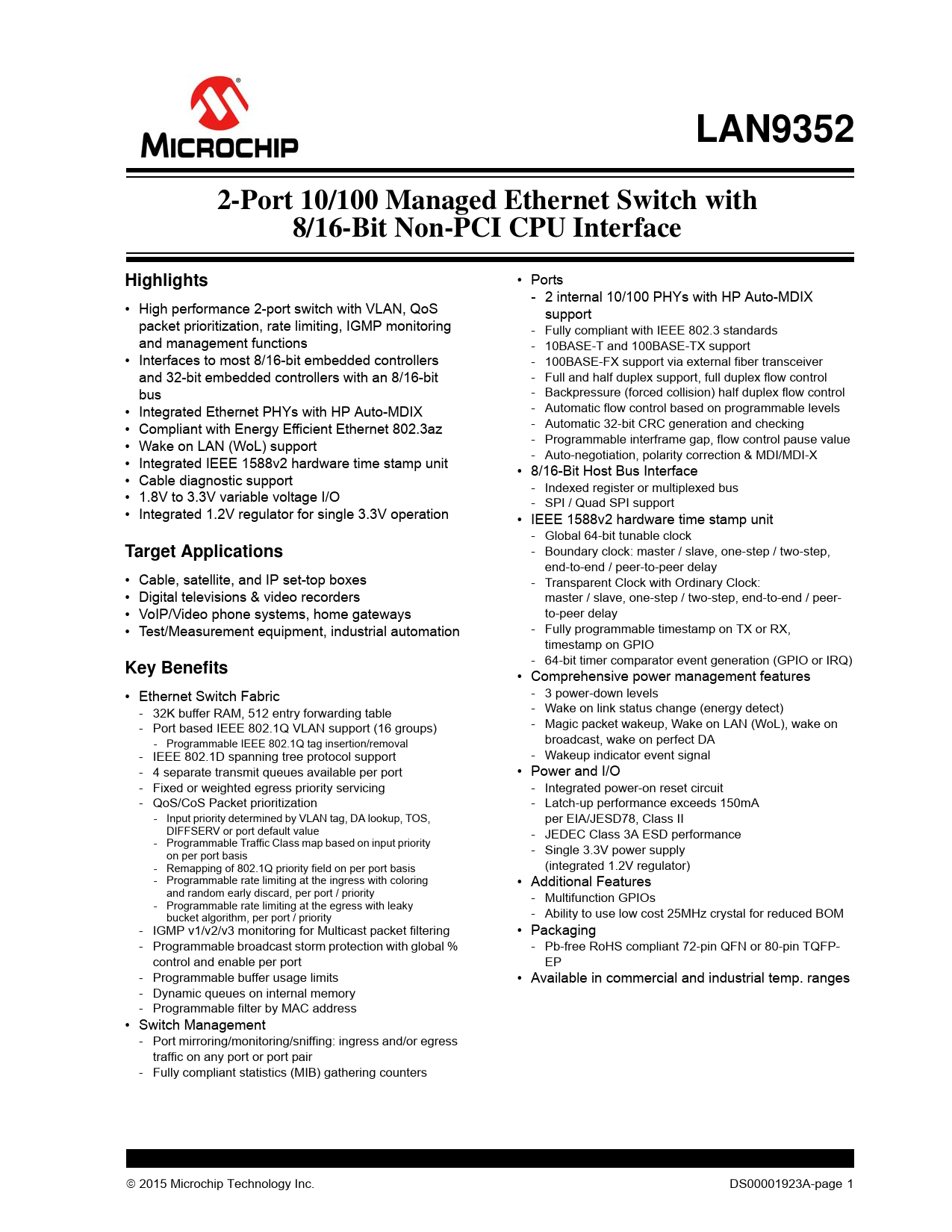 LAN9352. 2-Port 10/100 Managed Ethernet Switch with. 8/16-Bit Non-PCI CPU Interface. Highlights. Target Applications