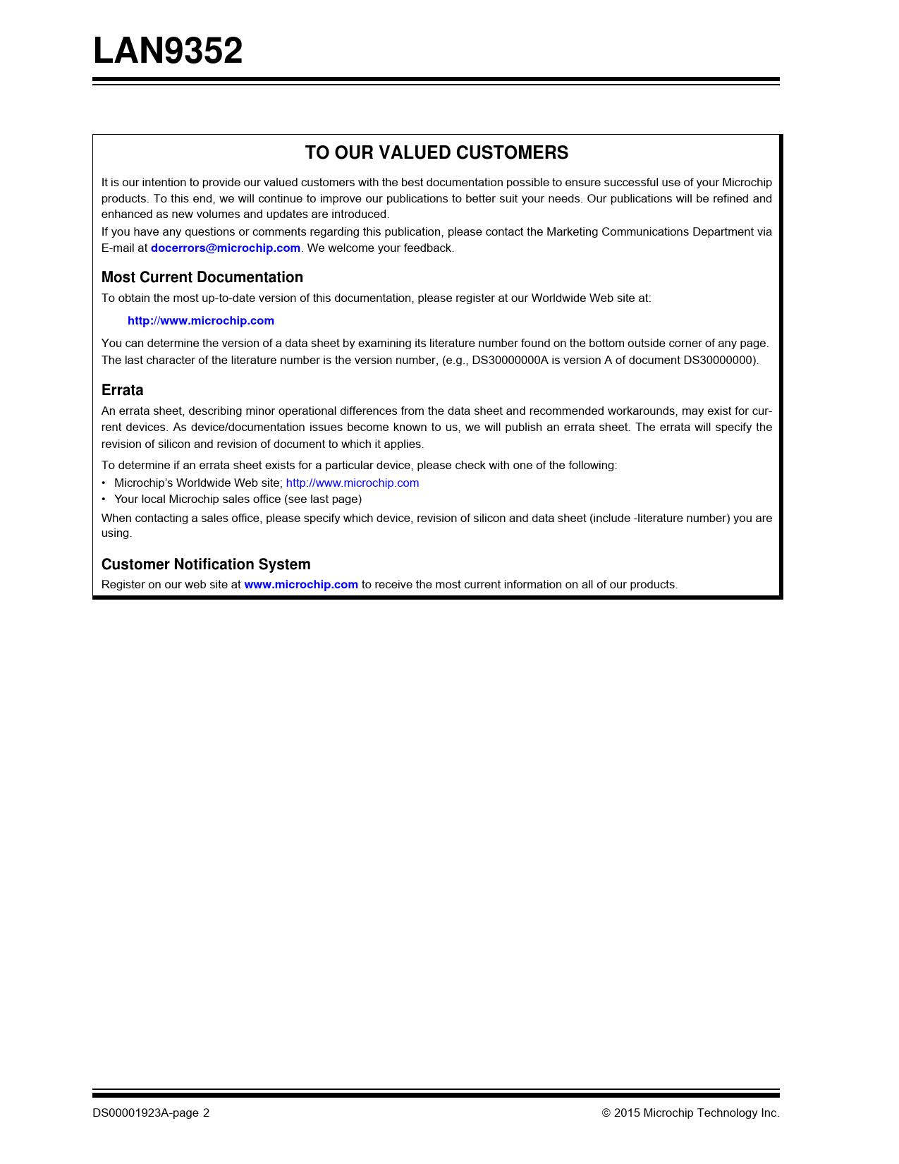| Pages / Page | 601 / 2 — LAN9352. TO OUR VALUED CUSTOMERS. docerrors@microchip.com. Most Current … |