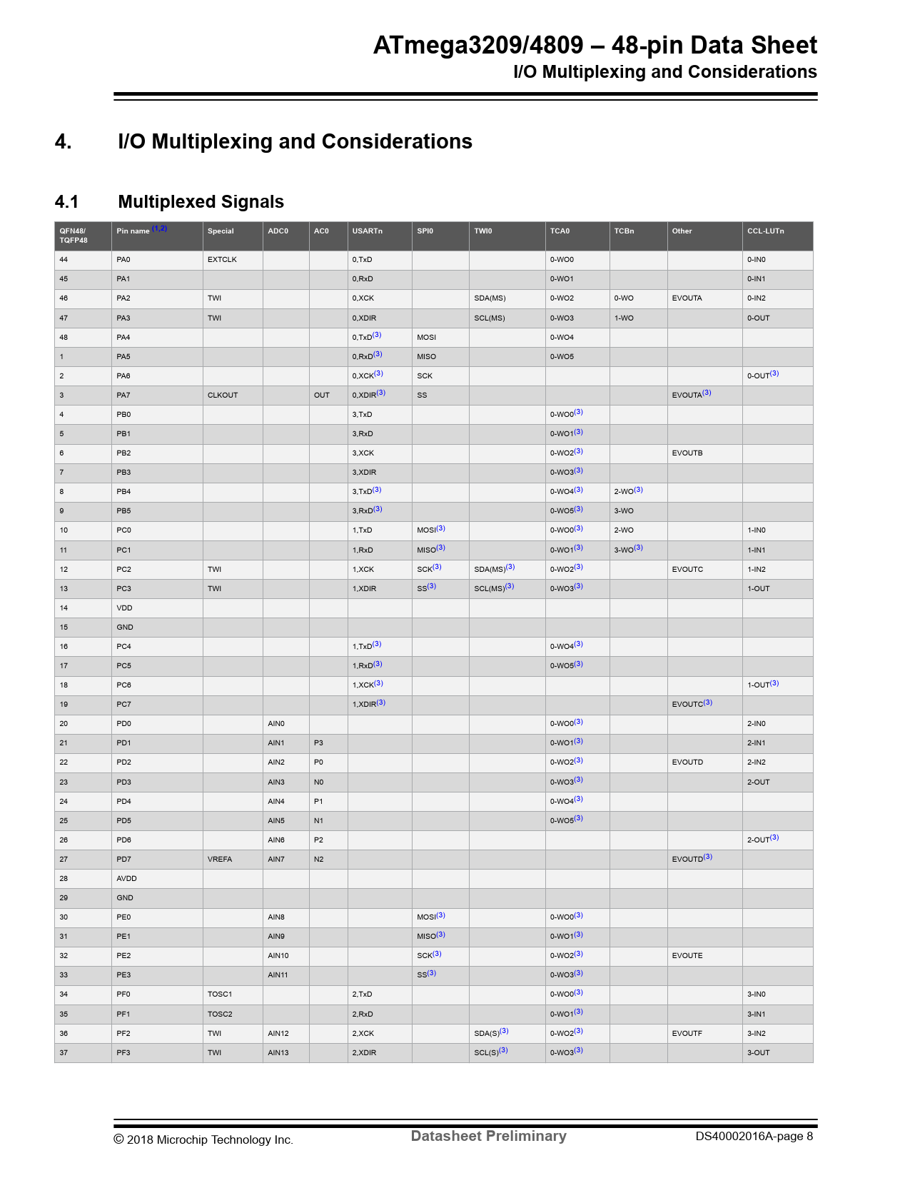 | Pages / Page | 68 / 8 — ATmega3209/4809 – 48-pin Data Sheet. I/O Multiplexing and Considerations. … |