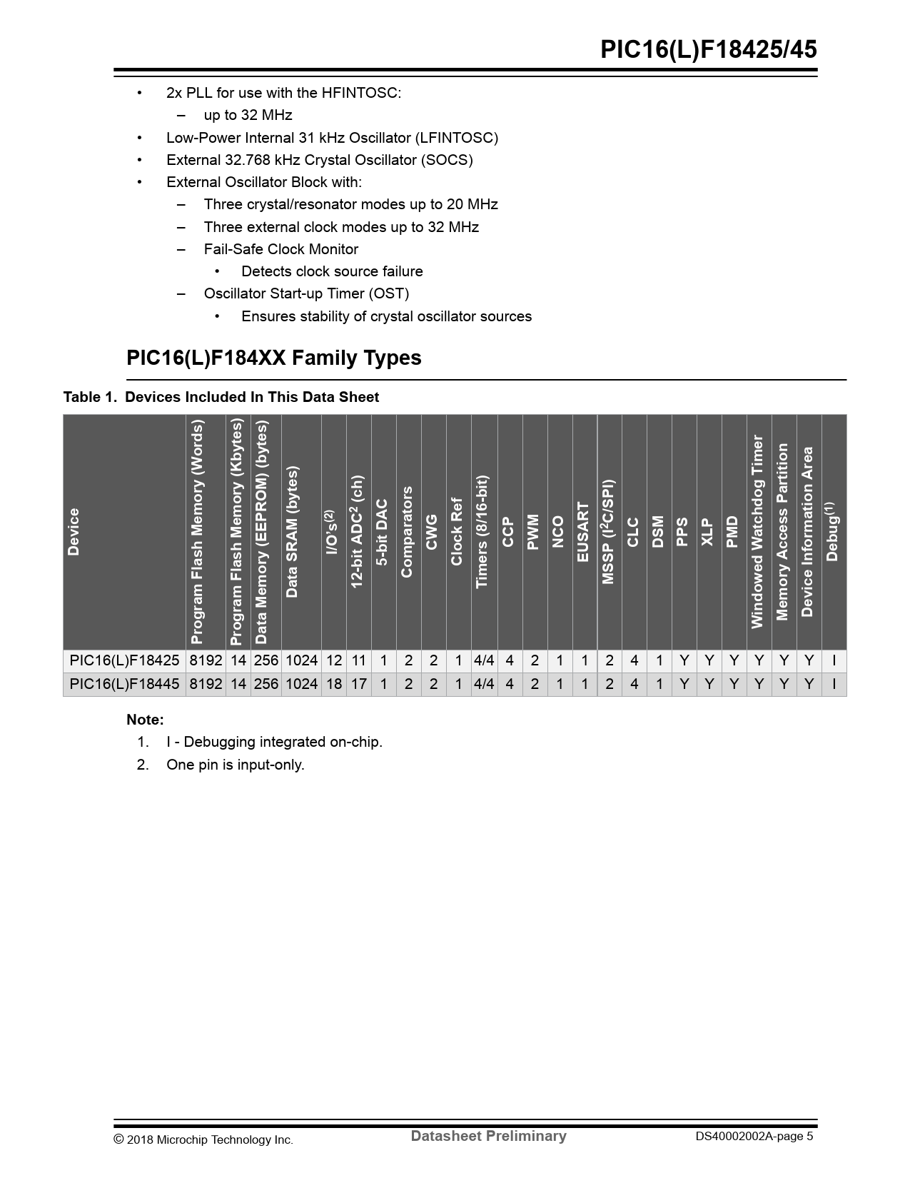 1. I - Debugging integrated on-chip. 2. One pin is input-only. © 2018 Microchip Technology Inc.