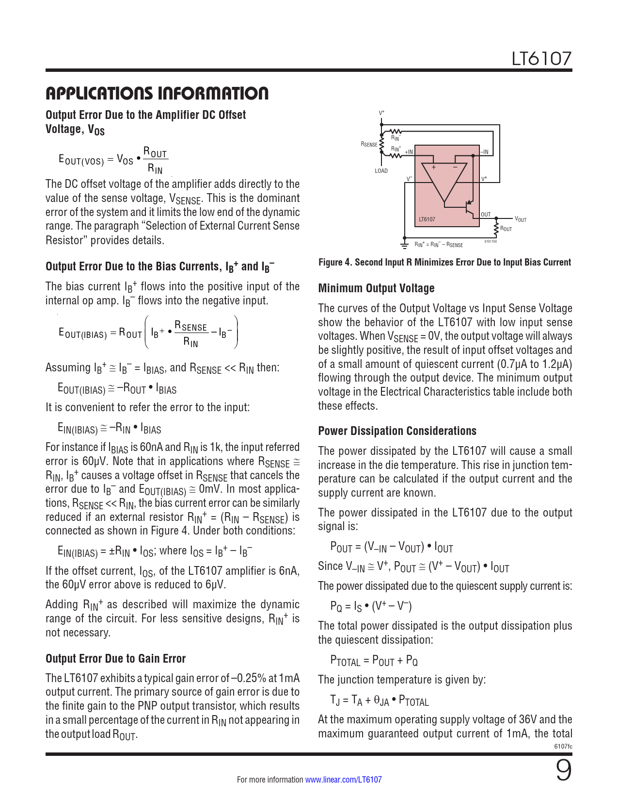 LT6107 APPLICATIONS INFORMATION Output Error Due to the Amplifier DC Offset V+ Voltage, VOS R – IN R R SENSE R + IN E OUT +IN –IN OUT(VOS) VOS • R + – IN LOAD The DC offset voltage of the amplifier adds directly to the V+ V– value of the sense voltage, VSENSE. This is the dominant error of the system and it limits the low end of the dynamic OUT range. The paragraph “Selection of External Current Sense LT6107 VOUT ROUT Resistor” provides details. + – 6107 F04 RIN = RIN – RSENSE Output Error Due to the Bias Currents, I +–Figure 4. Second Input R Minimizes Error Due to Input Bias CurrentB and IB The bias current I + B flows into the positive input of the Minimum Output Voltage internal op amp. I – B flows into the negative input. The curves of the Output Voltage vs Input Sense Voltage R show the behavior of the LT6107 with low input sense E SENSE OUT(IBIAS) ROUT IB • – IB– voltages. When VSENSE = 0V, the output voltage will always RIN be slightly positive, the result of input offset voltages and Assuming I + – of a small amount of quiescent current (0.7µA to 1.2µA) B IB = IBIAS, and RSENSE << RIN then: flowing through the output device. The minimum output EOUT(IBIAS) –ROUT • IBIAS voltage in the Electrical Characteristics table include both It is convenient to refer the error to the input: these effects. EIN(IBIAS) –RIN • IBIAS Power Dissipation Considerations For instance if IBIAS is 60nA and RIN is 1k, the input referred The power dissipated by the LT6107 will cause a small error is 60µV. Note that in applications where RSENSE increase in the die temperature. This rise in junction tem- R + IN, IB causes a voltage offset in RSENSE that cancels the perature can be calculated if the output current and the error due to I – B and EOUT(IBIAS) 0mV. In most applica- supply current are known. tions, RSENSE << RIN, the bias current error can be similarly reduced if an external resistor R + The power dissipated in the LT6107 due to the output IN = (RIN – RSENSE) is connected as shown in Figure 4. Under both conditions: signal is: E + – P IN(IBIAS) = ±RIN • IOS; where IOS = IB – IB OUT = (V–IN – VOUT) • IOUT If the offset current, I Since V OS, of the LT6107 amplifier is 6nA, –IN V+, POUT (V+ – VOUT) • IOUT the 60µV error above is reduced to 6µV. The power dissipated due to the quiescent supply current is: Adding R + IN as described will maximize the dynamic PQ = IS • (V+ – V–) range of the circuit. For less sensitive designs, R + IN is not necessary. The total power dissipated is the output dissipation plus the quiescent dissipation: Output Error Due to Gain Error PTOTAL = POUT + PQ The LT6107 exhibits a typical gain error of –0.25% at 1mA The junction temperature is given by: output current. The primary source of gain error is due to the finite gain to the PNP output transistor, which results TJ = TA + JA • PTOTAL in a small percentage of the current in RIN not appearing in At the maximum operating supply voltage of 36V and the the output load ROUT. maximum guaranteed output current of 1mA, the total 6107fc For more information www.linear.com/LT6107 9
