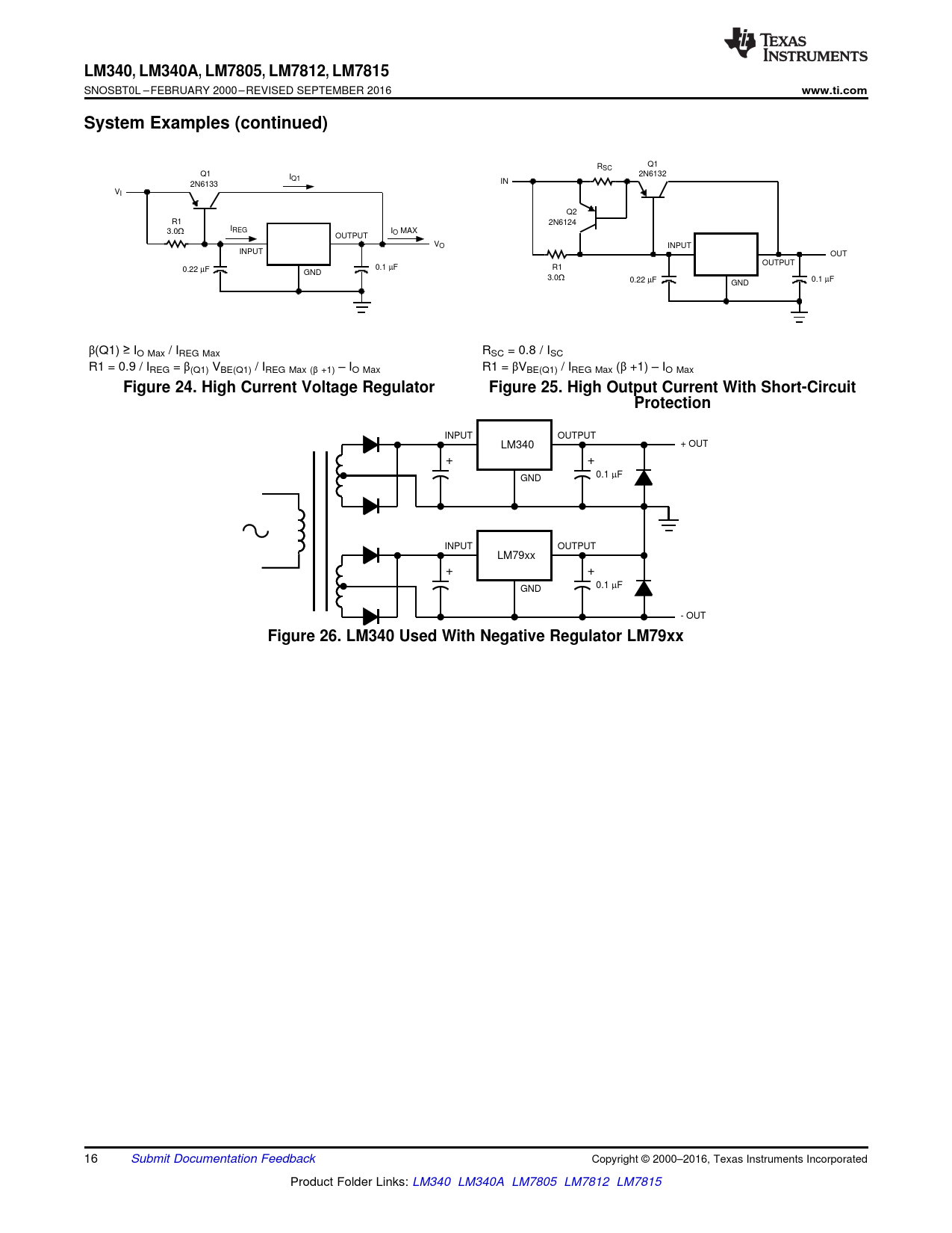 LM340,. LM340A. , LM7805,. LM7812. , LM7815. www.ti.com. System Examples (continued). Figure 24. High Current Voltage Regulator