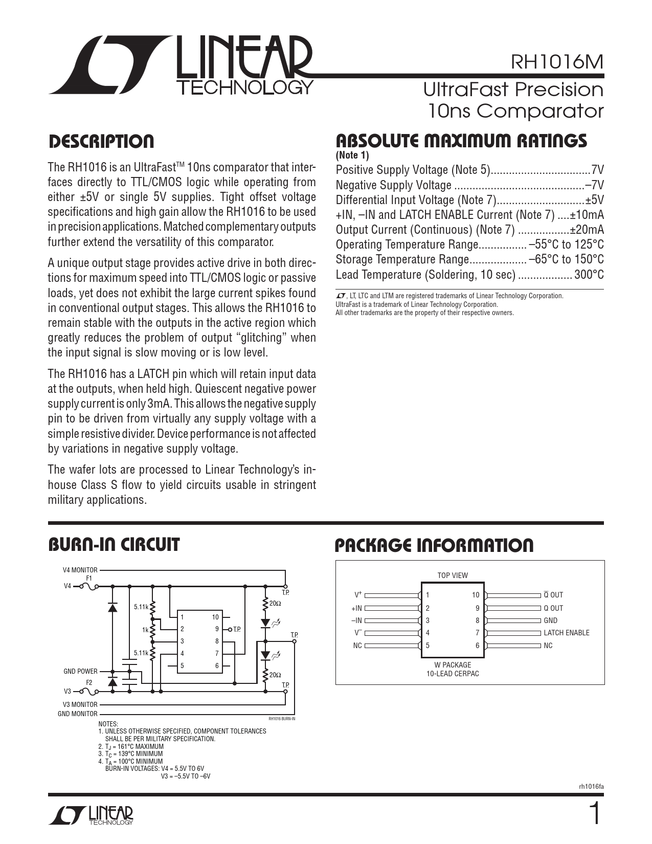 V4 MONITOR F1 TOP VIEW V4 T.P. V+ 1 10 Q OUT 20Ω 5.11k +IN 2 9 Q OUT 1 10 –IN 3 8 GND 1k 2 9 T.P. T.P. V– 4 7 LATCH ENABLE 3 8 NC 5 6 NC 5.11k 4 7 5 6 W PACKAGE GND POWER 20Ω 10-LEAD CERPAC F2 T.P. V3 V3 MONITOR GND MONITOR RH1016 BURN-IN NOTES: 1. UNLESS OTHERWISE SPECIFIED, COMPONENT TOLERANCES SHALL BE PER MILITARY SPECIFICATION. 2. TJ = 161°C MAXIMUM 3. TC = 139°C MINIMUM 4. TA = 100°C MINIMUM BURN-IN VOLTAGES: V4 = 5.5V TO 6V V3 = –5.5V TO –6V rh1016fa 1