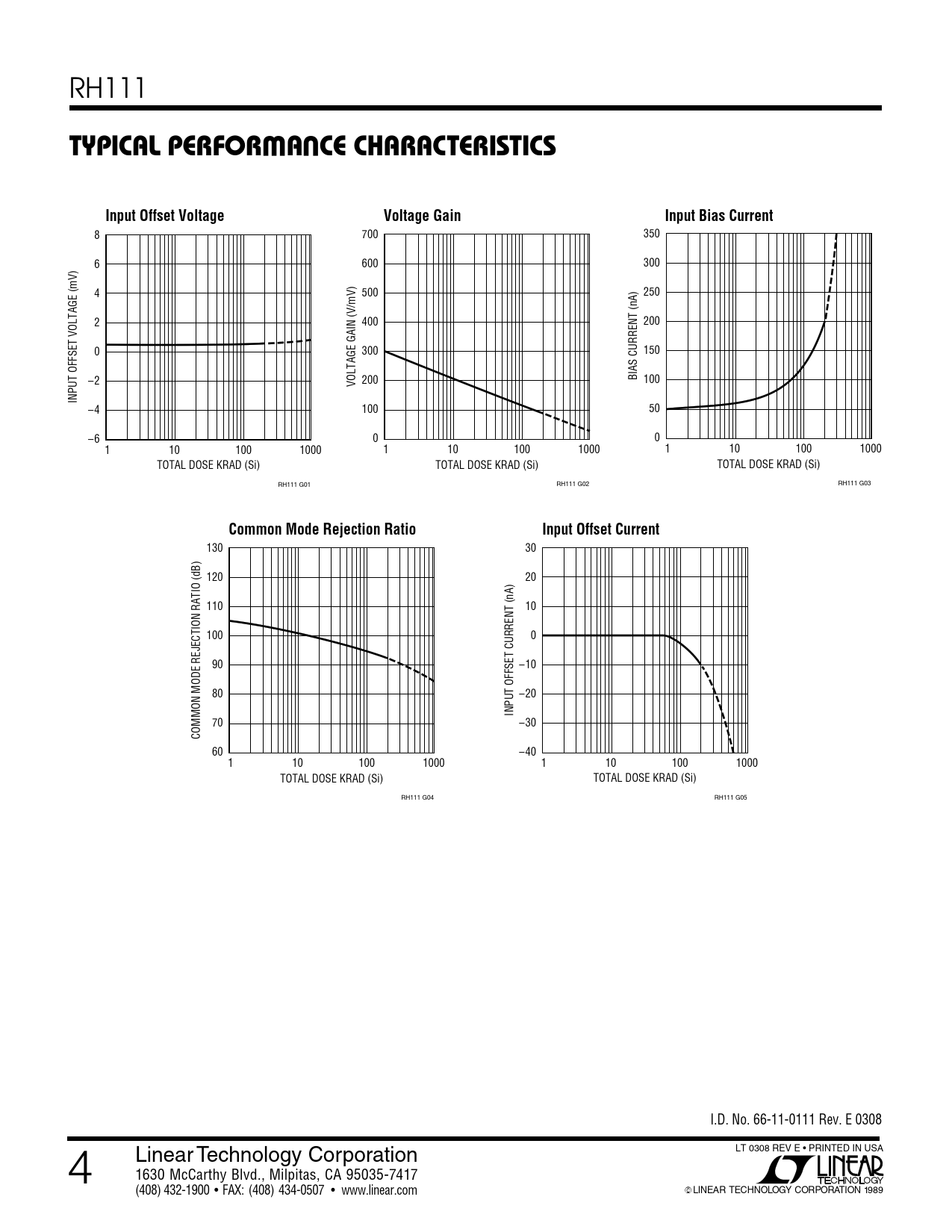 130 30 120 20 110 10 100 0 90 –10 80 –20 INPUT OFFSET CURRENT (nA) 70 –30 COMMON MODE REJECTION RATIO (dB) 60 –40 1 10 100 1000 1 10 100 1000 TOTAL DOSE KRAD (Si) TOTAL DOSE KRAD (Si) RH111 G04 RH111 G05 I.D. No. 66-11-0111 Rev. E 0308 LT 0308 REV E • PRINTED IN USA 4 Linear Technology Corporation 1630 McCarthy Blvd., Milpitas, CA 95035-7417 (408) 432-1900 ● FAX: (408) 434-0507 ● www.linear.com © LINEAR TECHNOLOGY CORPORATION 1989