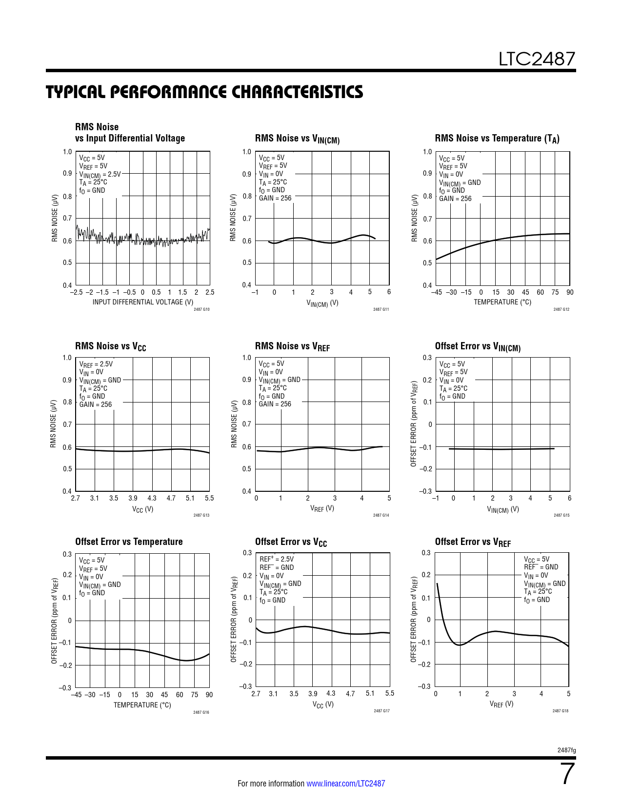 1.0 1.0 1.0 VCC = 5V VCC = 5V VCC = 5V VREF = 5V VREF = 5V VREF = 5V 0.9 VIN(CM) = 2.5V 0.9 VIN = 0V 0.9 VIN = 0V TA = 25°C TA = 25°C VIN(CM) = GND f fO = GND f 0.8 O = GND 0.8 O = GND GAIN = 256 0.8 GAIN = 256 0.7 0.7 0.7 RMS NOISE (µV) 0.6 RMS NOISE (µV) 0.6 RMS NOISE (µV) 0.6 0.5 0.5 0.5 0.4 0.4 0.4 –2.5 –2 –1.5 –1 –0.5 0 0.5 1 1.5 2 2.5 –1 0 1 2 3 4 5 6 –45 –30 –15 0 15 30 45 60 75 90 INPUT DIFFERENTIAL VOLTAGE (V) VIN(CM) (V) TEMPERATURE (°C) 2487 G10 2487 G11 2487 G12