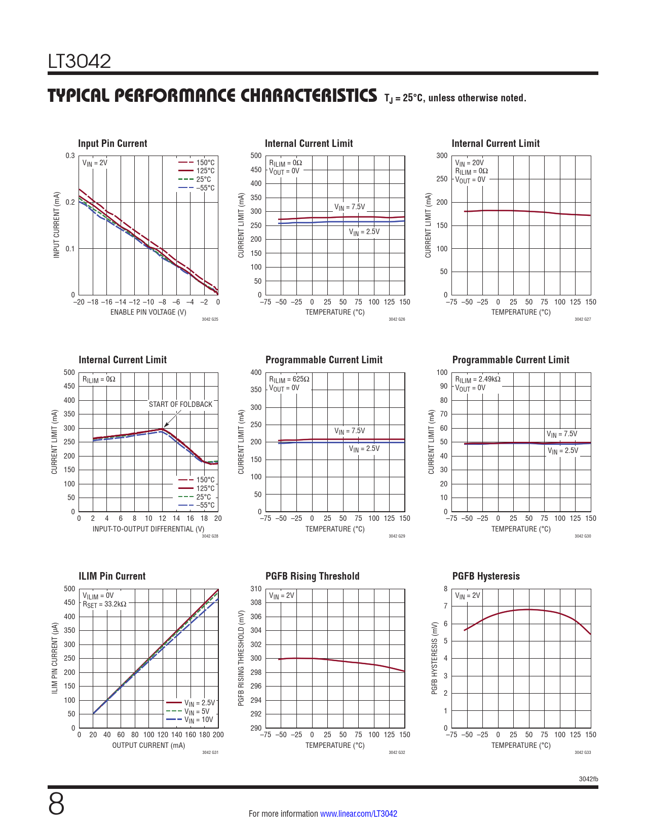 0.3 500 300 VIN = 2V 150°C RILIM = 0Ω VIN = 20V 125°C 450 VOUT = 0V RILIM = 0Ω 25°C 250 VOUT = 0V –55°C 400 350 0.2 V 200 300 IN = 7.5V 250 150 VIN = 2.5V 200 0.1 100 INPUT CURRENT (mA) CURRENT LIMIT (mA) 150 CURRENT LIMIT (mA) 100 50 50 0 0 0 –20 –18 –16 –14 –12 –10 –8 –6 –4 –2 0 –75 –50 –25 0 25 50 75 100 125 150 –75 –50 –25 0 25 50 75 100 125 150 ENABLE PIN VOLTAGE (V) TEMPERATURE (°C) TEMPERATURE (°C) 3042 G25 3042 G26 3042 G27