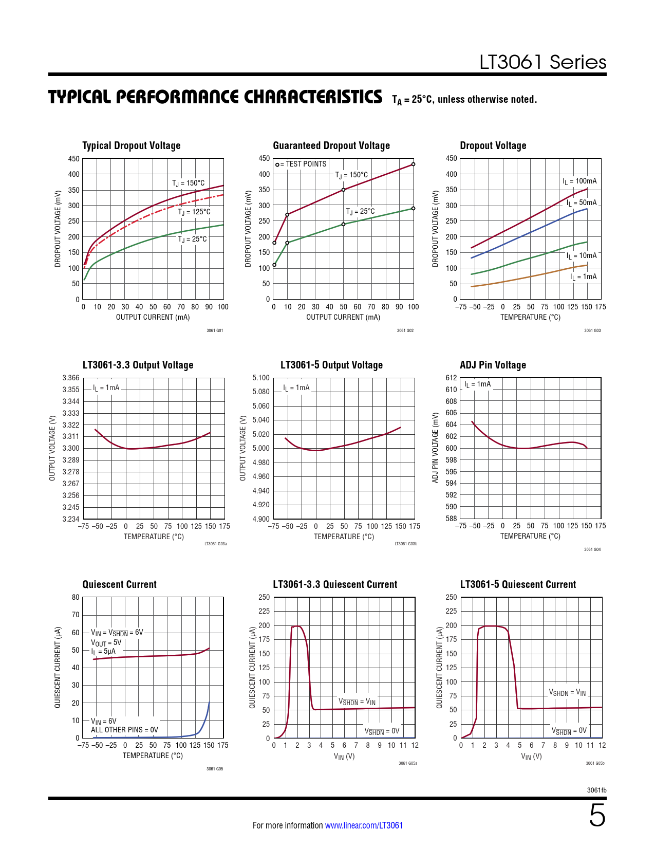 LT3061-3.3 Output Voltage LT3061-5 Output Voltage ADJ Pin Voltage