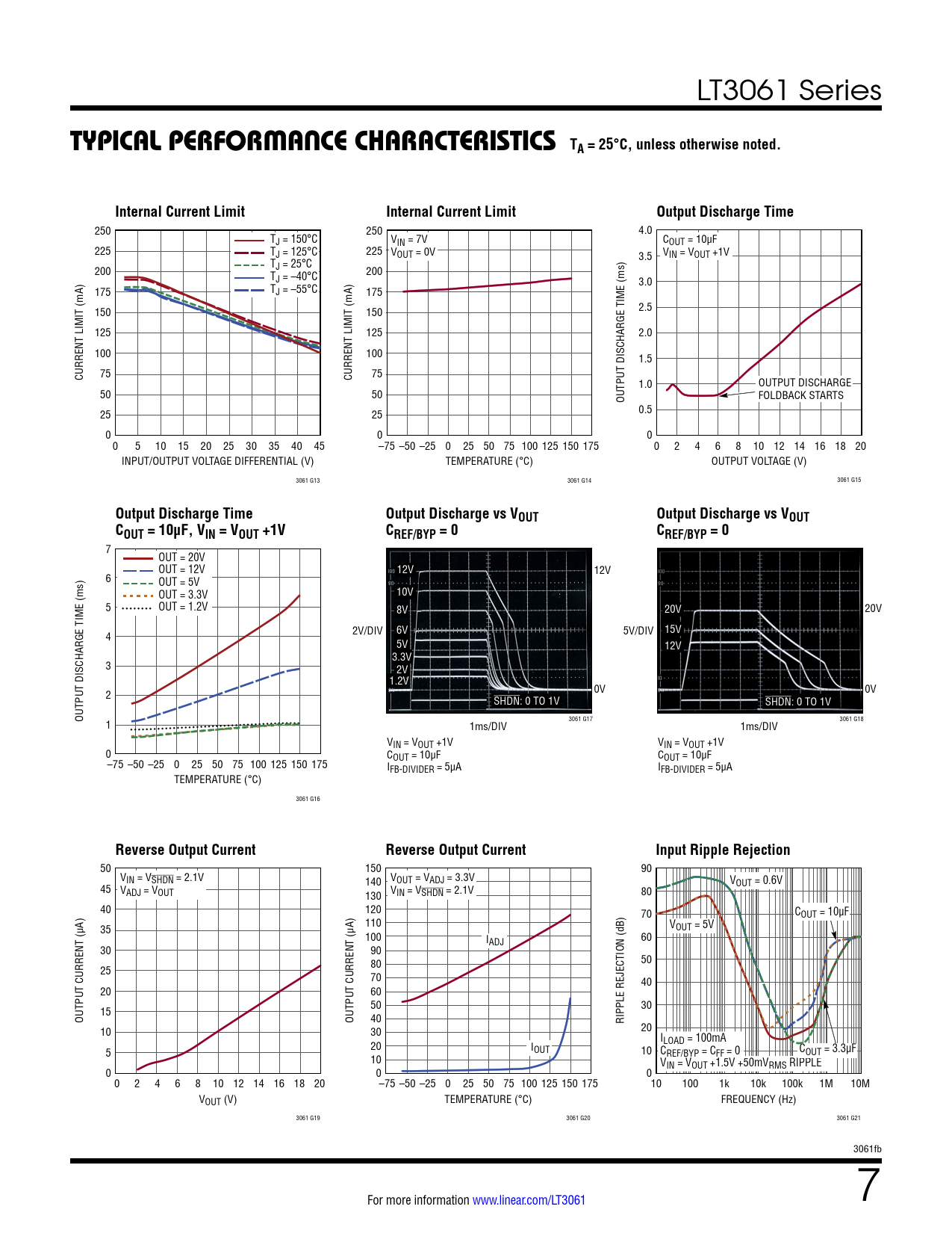 50 150 90 VIN = VSHDN = 2.1V 140 VOUT = VADJ = 3.3V V 45 V OUT = 0.6V ADJ = VOUT 130 VIN = VSHDN = 2.1V 80 40 120 70 COUT = 10µF 110 35 VOUT = 5V 100 IADJ 60 30 90 80 50 25 70 40 20 60 50 30 15 OUTPUT CURRENT (µA) OUTPUT CURRENT (µA) 40 RIPPLE REJECTION (dB) 10 30 20 I 20 LOAD = 100mA 5 IOUT 10 C COUT = 3.3µF 10 REF/BYP = CFF = 0 VIN = VOUT +1.5V +50mVRMS RIPPLE 0 0 0 0 2 4 6 8 10 12 14 16 18 20 –75 –50 –25 0 25 50 75 100 125 150 175 10 100 1k 10k 100k 1M 10M VOUT (V) TEMPERATURE (°C) FREQUENCY (Hz) 3061 G19 3061 G20 3061 G21 3061fb For more information www.linear.com/LT3061 7