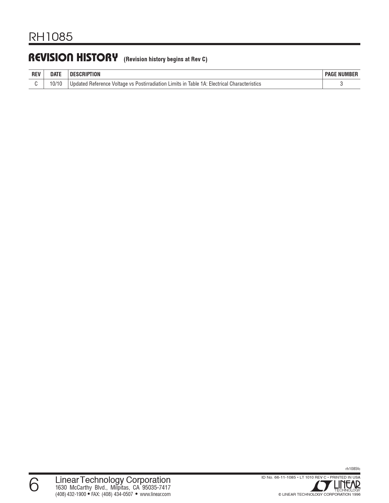 C 10/10 Updated Reference Voltage vs Postirradiation Limits in Table 1A: Electrical Characteristics 3 rh1085fc 6 Linear Technology Corporation ID No. 66-11-1085 • LT 1010 REV C • PRINTED IN USA 1630 McCarthy Blvd., Milpitas, CA 95035-7417 (408) 432-1900 ● FAX: (408) 434-0507 ● www.linear.com © LINEAR TECHNOLOGY CORPORATION 1996