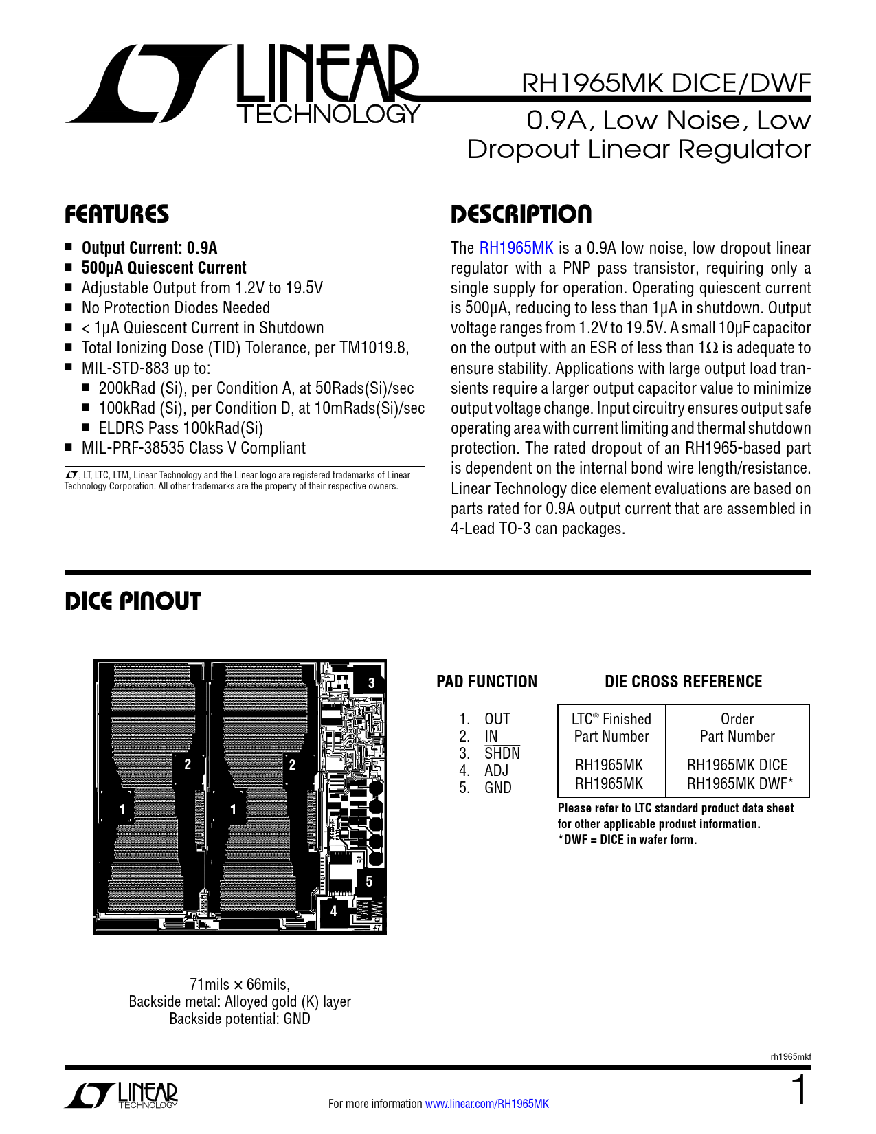 71mils × 66mils, Backside metal: Alloyed gold (K) layer Backside potential: GND rh1965mkf For more information www.linear.com/RH1965MK 1 Document Outline Features Description Dice Pinout Absolute Maximum Ratings Table 1: DICE/DWF Electrical Test Limits Table 2: Electrical Characteristics Table 3: Electrical Characteristics Table 4. Post Burn-In Endpoints and Delta Limit Requirements Table 5. Electrical Test Requirements Total Dose Bias Circuit Burn-In Circuit Typical Performance Characteristics