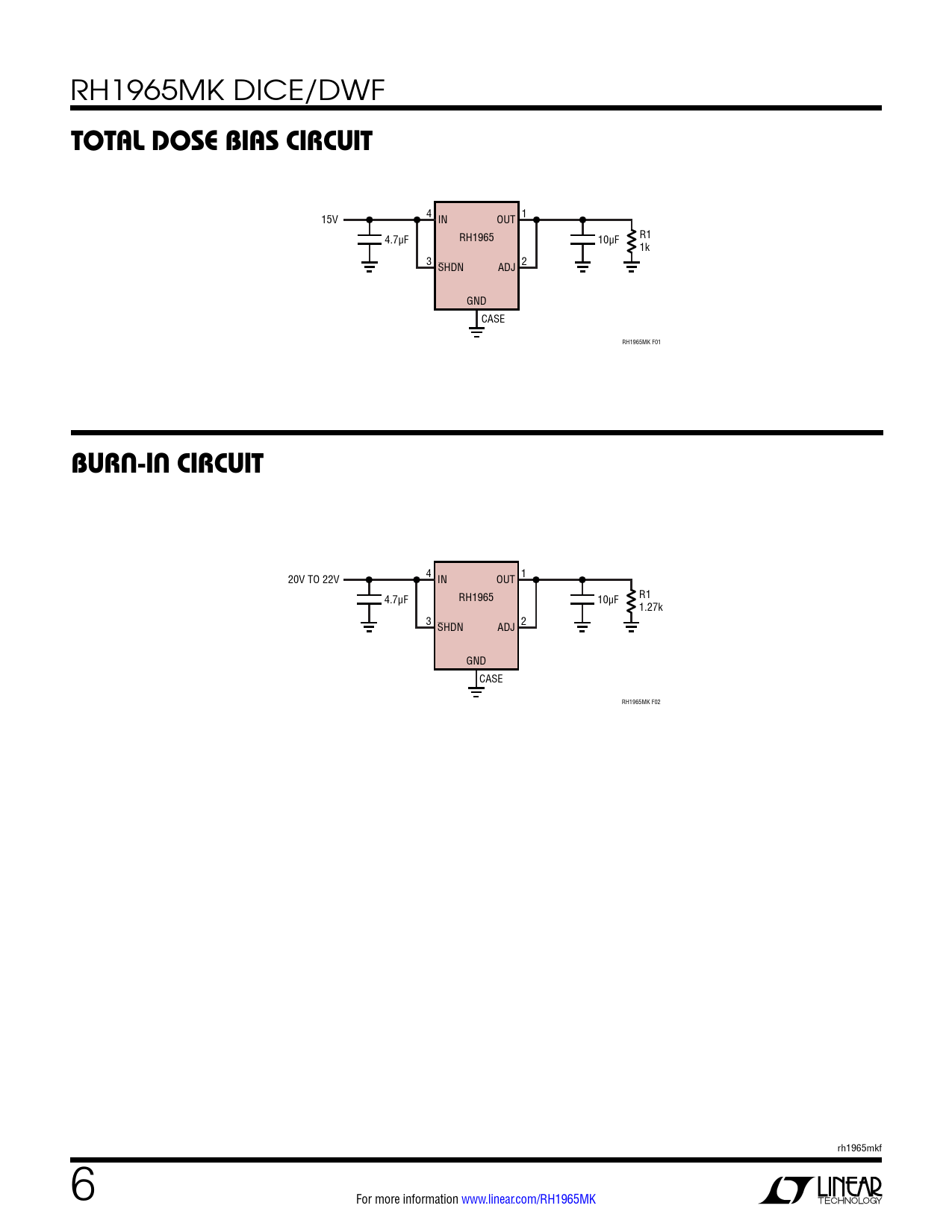 4 20V TO 22V IN OUT 1 4.7µF RH1965 10µF R1 1.27k 3 SHDN ADJ 2 GND CASE RH1965MK F02 rh1965mkf 6 For more information www.linear.com/RH1965MK Document Outline Features Description Dice Pinout Absolute Maximum Ratings Table 1: DICE/DWF Electrical Test Limits Table 2: Electrical Characteristics Table 3: Electrical Characteristics Table 4. Post Burn-In Endpoints and Delta Limit Requirements Table 5. Electrical Test Requirements Total Dose Bias Circuit Burn-In Circuit Typical Performance Characteristics