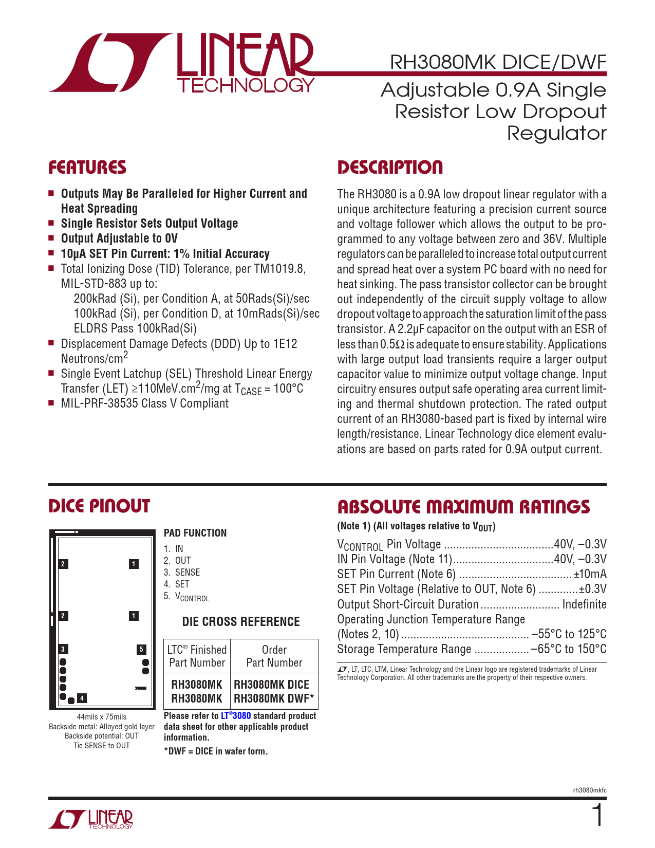 RH3080MK DICE/DWF Adjustable 0.9A Single Resistor Low Dropout Regulator FEATURESDESCRIPTION n Outputs May Be Paralleled for Higher Current and The RH3080 is a 0.9A low dropout linear regulator with a Heat Spreading unique architecture featuring a precision current source n Single Resistor Sets Output Voltage and voltage follower which allows the output to be pro- n Output Adjustable to 0V grammed to any voltage between zero and 36V. Multiple n 10µA SET Pin Current: 1% Initial Accuracy regulators can be paralleled to increase total output current n Total Ionizing Dose (TID) Tolerance, per TM1019.8, and spread heat over a system PC board with no need for MIL-STD-883 up to: heat sinking. The pass transistor collector can be brought 200kRad (Si), per Condition A, at 50Rads(Si)/sec out independently of the circuit supply voltage to allow 100kRad (Si), per Condition D, at 10mRads(Si)/sec dropout voltage to approach the saturation limit of the pass ELDRS Pass 100kRad(Si) transistor. A 2.2µF capacitor on the output with an ESR of n Displacement Damage Defects (DDD) Up to 1E12 less than 0.5Ω is adequate to ensure stability. Applications Neutrons/cm2 with large output load transients require a larger output n Single Event Latchup (SEL) Threshold Linear Energy capacitor value to minimize output voltage change. Input Transfer (LET) ≥110MeV.cm2/mg at TCASE = 100°C circuitry ensures output safe operating area current limit- n MIL-PRF-38535 Class V Compliant ing and thermal shutdown protection. The rated output current of an RH3080-based part is fixed by internal wire length/resistance. Linear Technology dice element evalu- ations are based on parts rated for 0.9A output current. DICE PINOUTABSOLUTE MAXIMUM RATINGS (Note 1) (All voltages relative to VPAD FUNCTIONOUT) V 1. IN CONTROL Pin Voltage ..40V, –0.3V 2. OUT IN Pin Voltage (Note 11) ...40V, –0.3V 21 3. SENSE SET Pin Current (Note 6) ... ±10mA 4. SET SET Pin Voltage (Relative to OUT, Note 6) ...±0.3V 5. VCONTROL Output Short-Circuit Duration .. Indefinite 21DIE CROSS REFERENCE Operating Junction Temperature Range (Notes 2, 10) .. –55°C to 125°C 35 LTC® Finished Order Storage Temperature Range .. –65°C to 150°C Part Number Part Number L, LT, LTC, LTM, Linear Technology and the Linear logo are registered trademarks of Linear Technology Corporation. All other trademarks are the property of their respective owners. RH3080MK RH3080MK DICE4RH3080MK RH3080MK DWF* 44mils x 75mils Please refer to LT®3080 standard product Backside metal: Alloyed gold layer data sheet for other applicable product Backside potential: OUT information. Tie SENSE to OUT *DWF = DICE in wafer form. rh3080mkfc 1