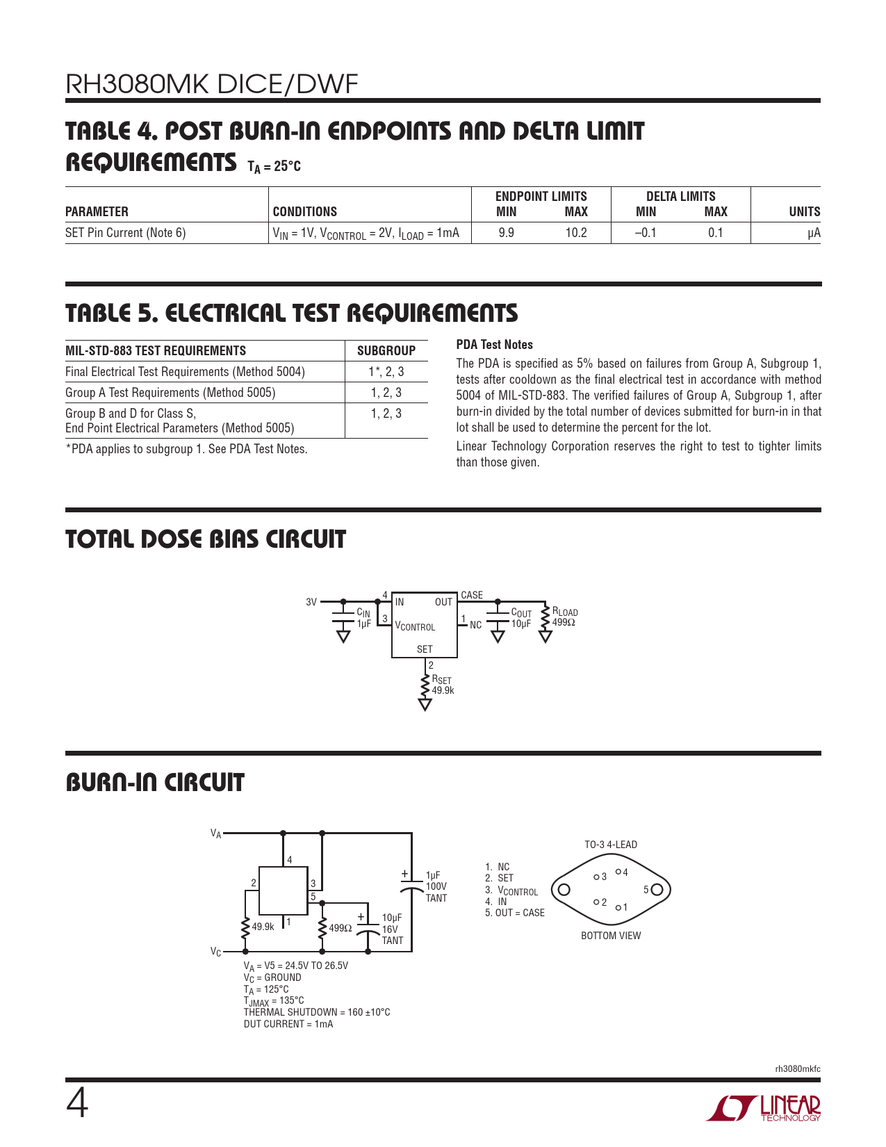 RH3080MK DICE/DWF TABLE 4. POST BURN-IN ENDPOINTS AND DELTA LIMIT REQUIREMENTS TA = 25°CENDPOINT LIMITSDELTA LIMITSPARAMETERCONDITIONSMINMAXMINMAXUNITS SET Pin Current (Note 6) VIN = 1V, VCONTROL = 2V, ILOAD = 1mA 9.9 10.2 –0.1 0.1 µA TABLE 5. ELECTRICAL TEST REQUIREMENTS MIL-STD-883 TEST REQUIREMENTSSUBGROUPPDA Test Notes The PDA is specified as 5% based on failures from Group A, Subgroup 1, Final Electrical Test Requirements (Method 5004) 1*, 2, 3 tests after cooldown as the final electrical test in accordance with method Group A Test Requirements (Method 5005) 1, 2, 3 5004 of MIL-STD-883. The verified failures of Group A, Subgroup 1, after Group B and D for Class S, 1, 2, 3 burn-in divided by the total number of devices submitted for burn-in in that End Point Electrical Parameters (Method 5005) lot shall be used to determine the percent for the lot. *PDA applies to subgroup 1. See PDA Test Notes. Linear Technology Corporation reserves the right to test to tighter limits than those given. TOTAL DOSE BIAS CIRCUIT 4 CASE 3V IN OUT CIN C R 3 1 OUT LOAD 1µF VCONTROL NC 10µF 499Ω SET 2 RSET 49.9k BURN-IN CIRCUIT VA TO-3 4-LEAD 4 + 1. NC 1µF 4 3 2 3 2. SET 100V 3. V 5 5 TANT CONTROL 4. IN 2 5. OUT = CASE 1 1 + 10µF 49.9k 499Ω 16V TANT BOTTOM VIEW VC VA = V5 = 24.5V TO 26.5V VC = GROUND TA = 125°C TJMAX = 135°C THERMAL SHUTDOWN = 160 ±10°C DUT CURRENT = 1mA rh3080mkfc 4