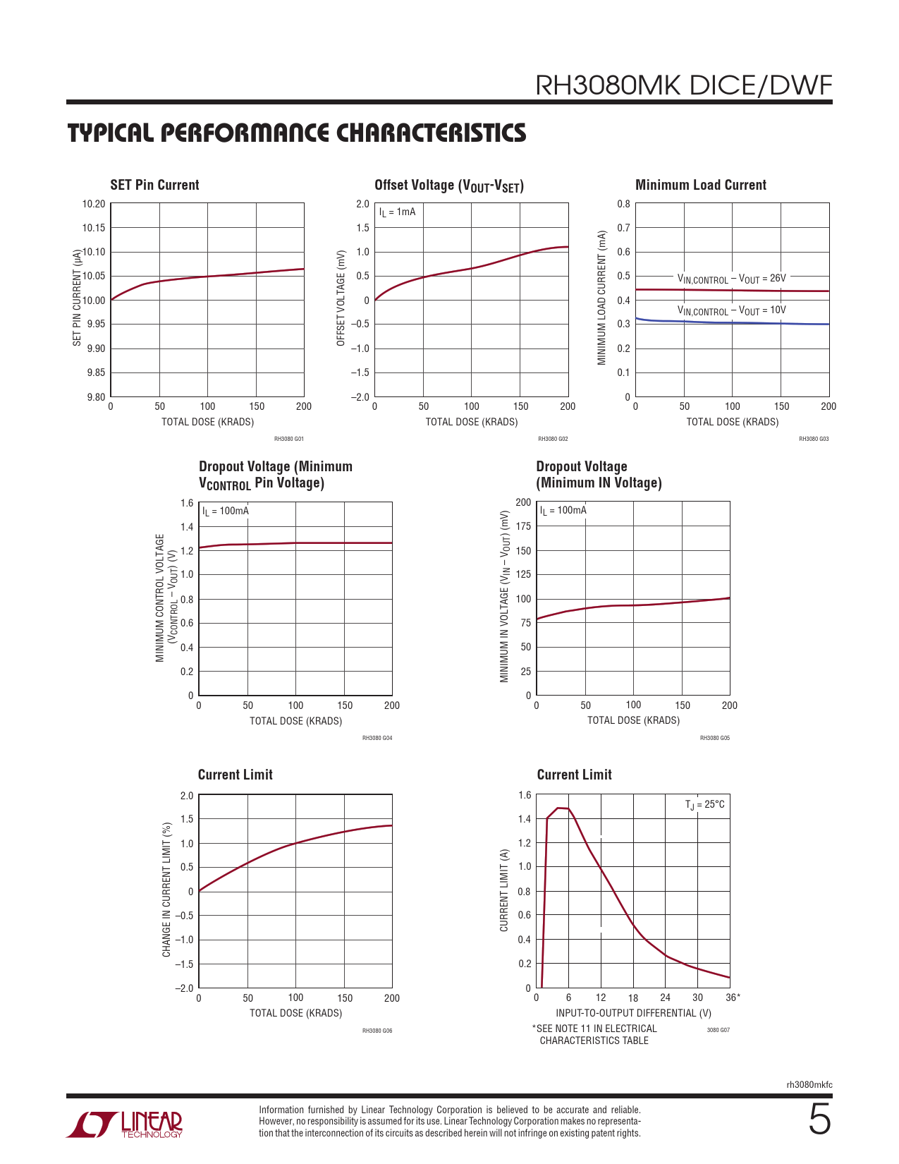 2.0 1.6 TJ = 25°C 1.5 1.4 1.0 1.2 0.5 1.0 0 0.8 –0.5 0.6 CURRENT LIMIT (A) –1.0 0.4 CHANGE IN CURRENT LIMIT (%) –1.5 0.2 –2.0 0 0 50 100 150 200 0 6 12 18 24 30 36* TOTAL DOSE (KRADS) INPUT-TO-OUTPUT DIFFERENTIAL (V) RH3080 G06 *SEE NOTE 11 IN ELECTRICAL 3080 G07 CHARACTERISTICS TABLE rh3080mkfc Information furnished by Linear Technology Corporation is believed to be accurate and reliable. However, no responsibility is assumed for its use. Linear Technology Corporation makes no representa- tion that the interconnection of its circuits as described herein will not infringe on existing patent rights. 5