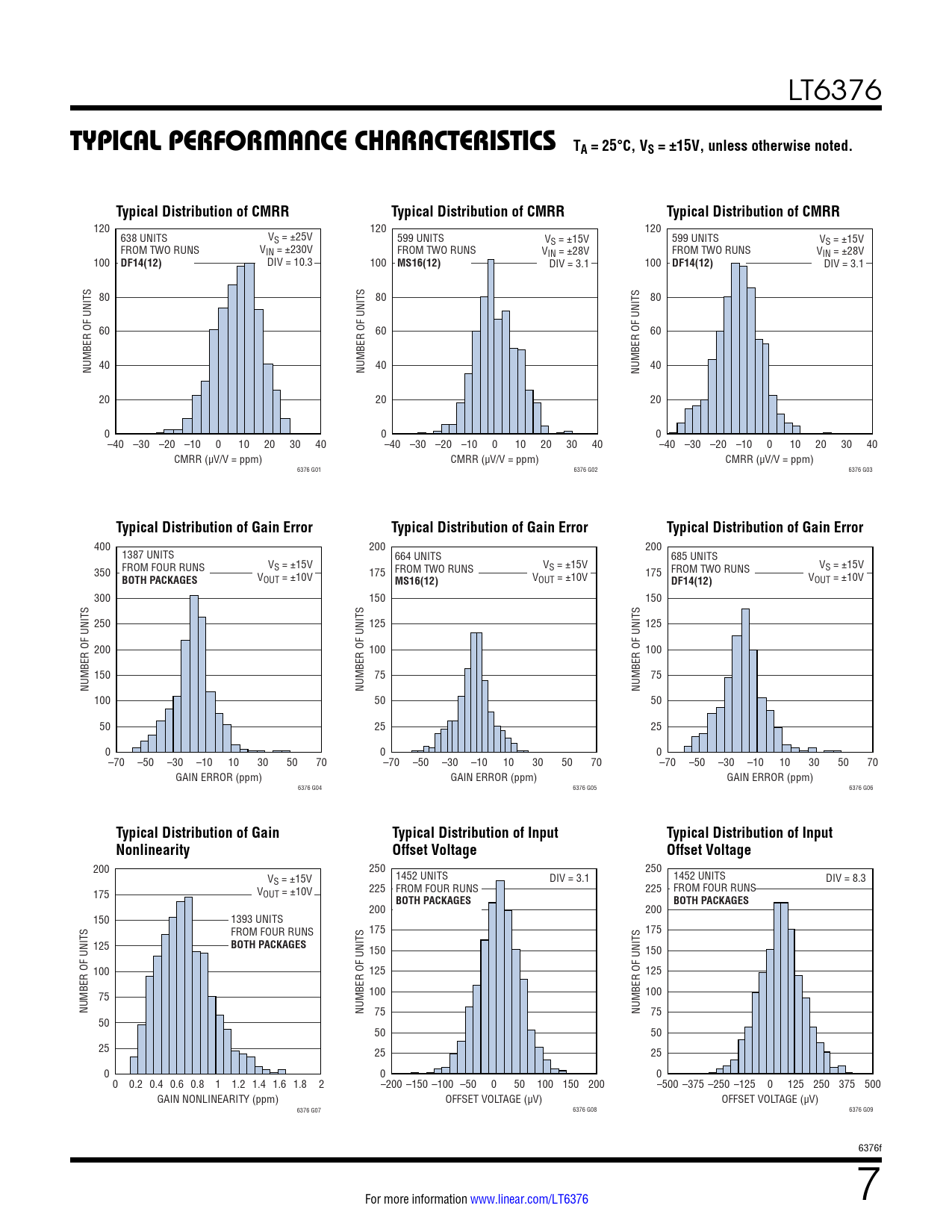 VOUT = ±10V 300 150 150 250 125 125 200 100 100 150 75 75 NUMBER OF UNITS NUMBER OF UNITS NUMBER OF UNITS 100 50 50 50 25 25 0 0 0 –70 –50 –30 –10 10 30 50 70 –70 –50 –30 –10 10 30 50 70 –70 –50 –30 –10 10 30 50 70 GAIN ERROR (ppm) GAIN ERROR (ppm) GAIN ERROR (ppm) 6376 G04 6376 G05 6376 G06