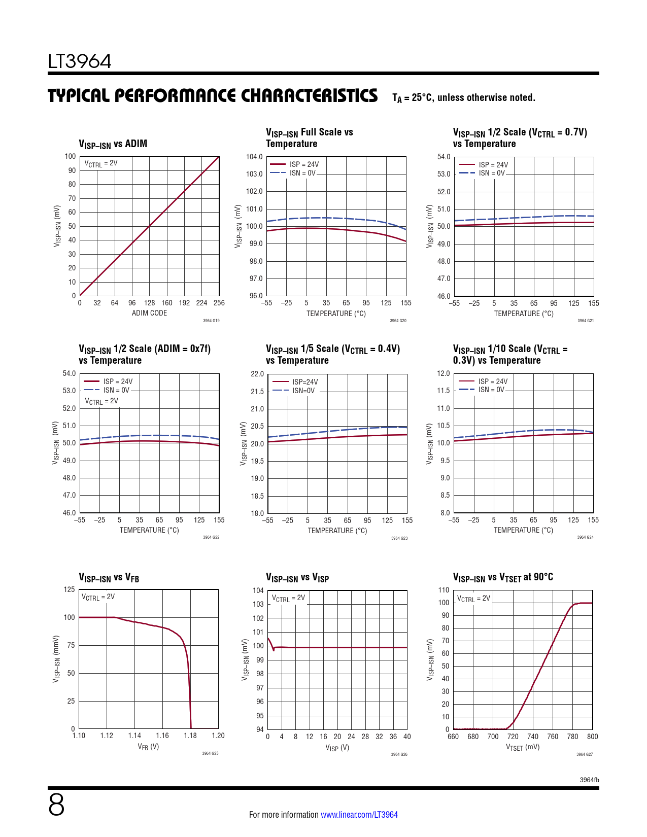 54.0 22.0 12.0 ISP = 24V ISP=24V ISP = 24V 53.0 ISN = 0V 21.5 ISN=0V 11.5 ISN = 0V VCTRL = 2V 52.0 21.0 11.0 51.0 20.5 10.5 (mV) (mV) 50.0 (mV) 20.0 10.0 V ISP–ISN 49.0 V ISP–ISN 19.5 V ISP–ISN 9.5 48.0 19.0 9.0 47.0 18.5 8.5 46.0 18.0 8.0 –55 –25 5 35 65 95 125 155 –55 –25 5 35 65 95 125 155 –55 –25 5 35 65 95 125 155 TEMPERATURE (°C) TEMPERATURE (°C) TEMPERATURE (°C) 3964 G22 3964 G23 3964 G24