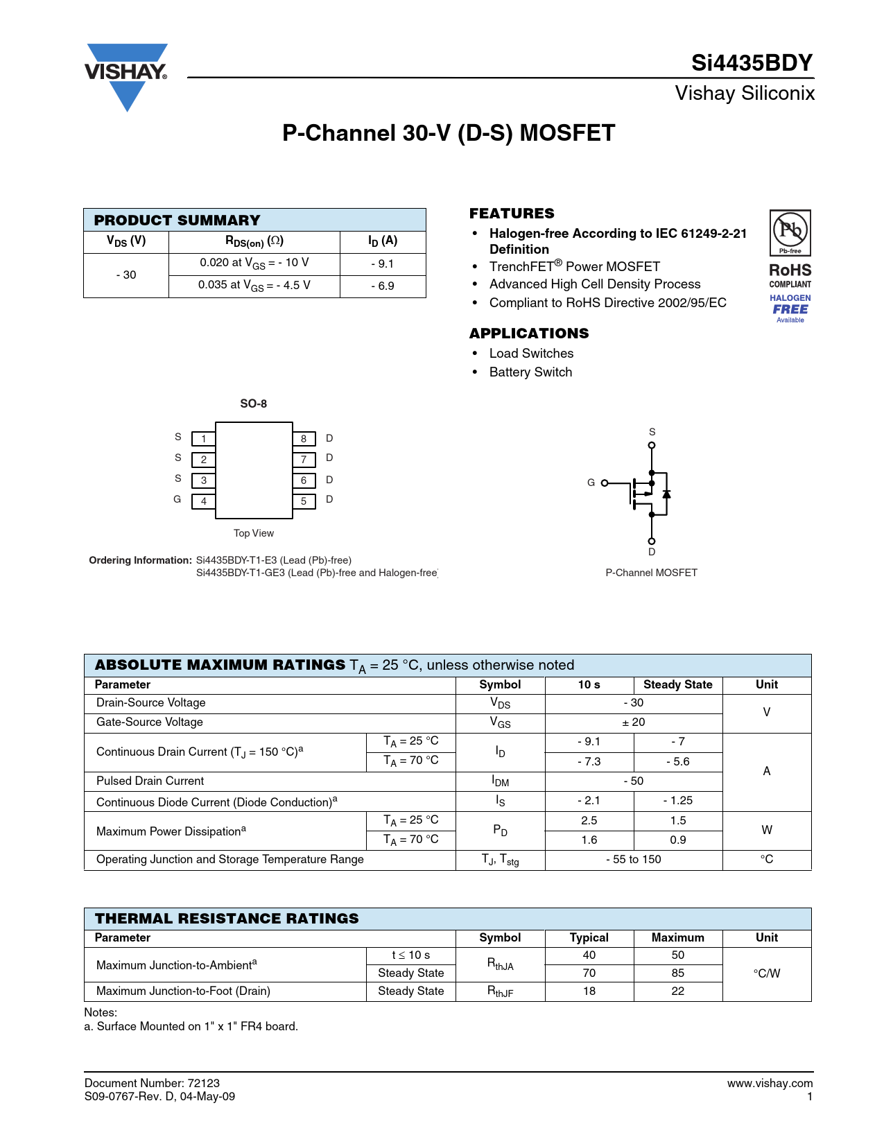 Si4435BDY. P-Channel 30-V (D-S) MOSFET. FEATURES. PRODUCT SUMMARY. Halogen-free According to IEC 61249-2-21. VDS (V). RDS(on) (