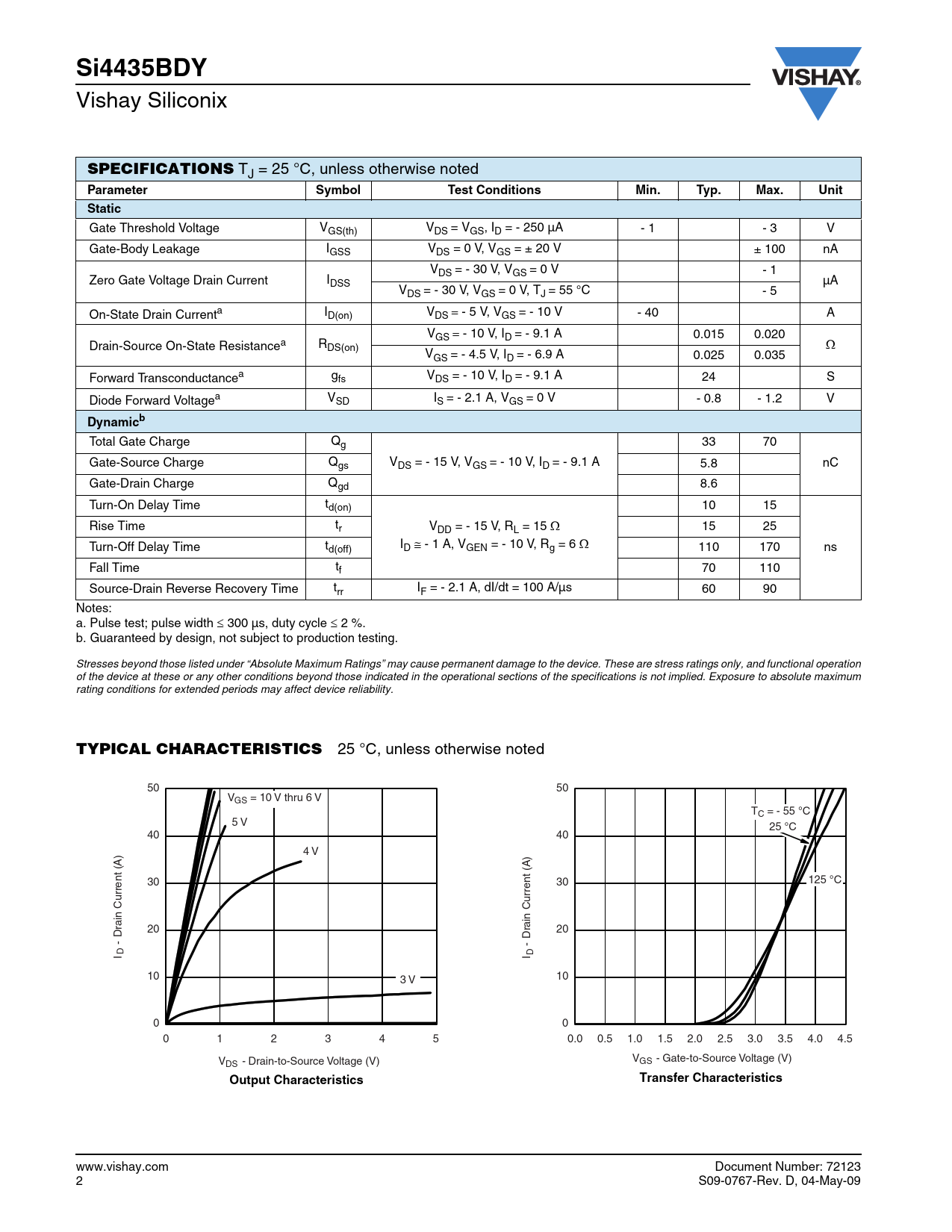 Si4435BDY Vishay Siliconix SPECIFICATIONS TJ = 25 °C, unless otherwise noted Parameter SymbolTestConditionsMin.Typ.Max.UnitStatic Gate Threshold Voltage VGS(th) VDS = VGS, ID = - 250 µA - 1 - 3 V Gate-Body Leakage IGSS VDS = 0 V, VGS = ± 20 V ± 100 nA VDS = - 30 V, VGS = 0 V - 1 Zero Gate Voltage Drain Current IDSS µA VDS = - 30 V, VGS = 0 V, TJ = 55 °C - 5 On-State Drain Currenta I = D(on) VDS - 5 V, VGS = - 10 V - 40 A V = GS - 10 V, ID = - 9.1 A 0.015 0.020 Drain-Source On-State Resistancea RDS(on) Ω VGS = - 4.5 V, ID = - 6.9 A 0.025 0.035 Forward Transconductancea gfs VDS = - 10 V, ID = - 9.1 A 24 S Diode Forward Voltagea VSD IS = - 2.1 A, VGS = 0 V - 0.8 - 1.2 V Dynamicb Total Gate Charge Qg 33 70 Gate-Source Charge Q V gs DS = - 15 V, VGS = - 10 V, ID = - 9.1 A 5.8 nC Gate-Drain Charge Qgd 8.6 Turn-On Delay Time td(on) 10 15 Rise Time tr VDD = - 15 V, RL = 15 Ω 15 25 I Turn-Off Delay Time td(off) D ≅ - 1 A, VGEN = - 10 V, Rg = 6 Ω 110 170 ns Fall Time tf 70 110 Source-Drain Reverse Recovery Time trr IF = - 2.1 A, dI/dt = 100 A/µs 60 90 Notes: a. Pulse test; pulse width ≤ 300 µs, duty cycle ≤ 2 %. b. Guaranteed by design, not subject to production testing. Stresses beyond those listed under “Absolute Maximum Ratings” may cause permanent damage to the device. These are stress ratings only, and functional operation of the device at these or any other conditions beyond those indicated in the operational sections of the specifications is not implied. Exposure to absolute maximum rating conditions for extended periods may affect device reliability. TYPICAL CHARACTERISTICS 25 °C, unless otherwise noted 50 50 VGS = 10 V thru 6 V TC = - 55 °C 5 V 25 °C 40 40 4 V 30 30 125 °C rain Current (A) ain Current (A) 20 D 20 - - Dr I D I D 10 3 V 10 0 0 0 1 2 3 4 5 0.0 0.5 1.0 1.5 2.0 2.5 3.0 3.5 4.0 4.5 V V DS - Drain-to-Source Voltage (V) GS - Gate-to-Source Voltage (V) Output CharacteristicsTransfer Characteristics www.vishay.com Document Number: 72123 2 S09-0767-Rev. D, 04-May-09