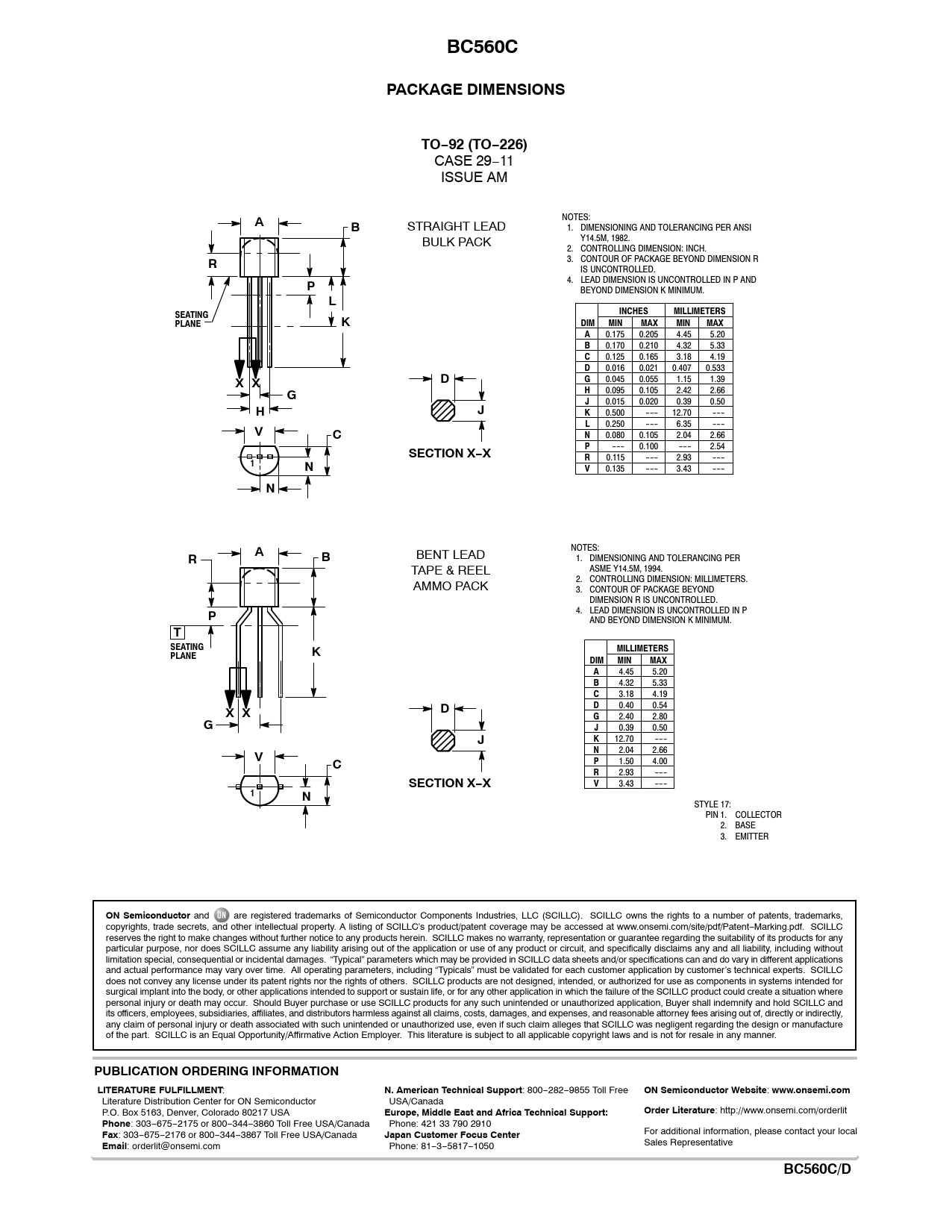 BC560CPACKAGE DIMENSIONSTO−92 (TO−226) CASE 29−11 ISSUE AM NOTES: AB STRAIGHT LEAD 1. DIMENSIONING AND TOLERANCING PER ANSI Y14.5M, 1982. BULK PACK 2. CONTROLLING DIMENSION: INCH. 3. CONTOUR OF PACKAGE BEYOND DIMENSION R R IS UNCONTROLLED. 4. LEAD DIMENSION IS UNCONTROLLED IN P AND P BEYOND DIMENSION K MINIMUM. LSEATINGINCHESMILLIMETERSPLANEKDIMMINMAXMINMAXA 0.175 0.205 4.45 5.20 B 0.170 0.210 4.32 5.33 C 0.125 0.165 3.18 4.19 D 0.016 0.021 0.407 0.533 DX XG 0.045 0.055 1.15 1.39 GH 0.095 0.105 2.42 2.66 J 0.015 0.020 0.39 0.50 HJK 0.500 --- 12.70 --- VL 0.250 --- 6.35 --- CN 0.080 0.105 2.04 2.66 SECTION X−XP --- 0.100 --- 2.54 R 0.115 --- 2.93 --- 1NV 0.135 --- 3.43 --- N NOTES: AB BENT LEAD 1. DIMENSIONING AND TOLERANCING PER R ASME Y14.5M, 1994. TAPE & REEL 2. CONTROLLING DIMENSION: MILLIMETERS. AMMO PACK 3. CONTOUR OF PACKAGE BEYOND DIMENSION R IS UNCONTROLLED. 4. LEAD DIMENSION IS UNCONTROLLED IN P P AND BEYOND DIMENSION K MINIMUM. TSEATINGKMILLIMETERSPLANEDIMMINMAXA 4.45 5.20 B 4.32 5.33 C 3.18 4.19 DX XD 0.40 0.54 GG 2.40 2.80 J 0.39 0.50 JK 12.70 --- VN 2.04 2.66 CP 1.50 4.00 R 2.93 --- SECTION X−XV 3.43 --- 1N STYLE 17: PIN 1. COLLECTOR 2. BASE 3. EMITTER ON Semiconductor and are registered trademarks of Semiconductor Components Industries, LLC (SCILLC). SCILLC owns the rights to a number of patents, trademarks, copyrights, trade secrets, and other intellectual property. A listing of SCILLC’s product/patent coverage may be accessed at www.onsemi.com/site/pdf/Patent−Marking.pdf. SCILLC reserves the right to make changes without further notice to any products herein. SCILLC makes no warranty, representation or guarantee regarding the suitability of its products for any particular purpose, nor does SCILLC assume any liability arising out of the application or use of any product or circuit, and specifically disclaims any and all liability, including without limitation special, consequential or incidental damages. “Typical” parameters which may be provided in SCILLC data sheets and/or specifications can and do vary in different applications and actual performance may vary over time. All operating parameters, including “Typicals” must be validated for each customer application by customer’s technical experts. SCILLC does not convey any license under its patent rights nor the rights of others. SCILLC products are not designed, intended, or authorized for use as components in systems intended for surgical implant into the body, or other applications intended to support or sustain life, or for any other application in which the failure of the SCILLC product could create a situation where personal injury or death may occur. Should Buyer purchase or use SCILLC products for any such unintended or unauthorized application, Buyer shall indemnify and hold SCILLC and its officers, employees, subsidiaries, affiliates, and distributors harmless against al claims, costs, damages, and expenses, and reasonable attorney fees arising out of, directly or indirectly, any claim of personal injury or death associated with such unintended or unauthorized use, even if such claim alleges that SCILLC was negligent regarding the design or manufacture of the part. SCILLC is an Equal Opportunity/Affirmative Action Employer. This literature is subject to all applicable copyright laws and is not for resale in any manner. PUBLICATION ORDERING INFORMATIONLITERATURE FULFILLMENT : N. American Technical Support : 800−282−9855 Toll Free ON Semiconductor Website : www.onsemi.com Literature Distribution Center for ON Semiconductor USA/Canada P.O. Box 5163, Denver, Colorado 80217 USA Europe, Middle East and Africa Technical Support:Order Literature : http://www.onsemi.com/orderlit Phone : 303−675−2175 or 800−344−3860 Toll Free USA/Canada Phone: 421 33 790 2910 Fax : 303−675−2176 or 800−344−3867 Toll Free USA/Canada Japan Customer Focus Center For additional information, please contact your local Email : orderlit@onsemi.com Phone: 81−3−5817−1050 Sales Representative http://onsemi.comBC560C/D4