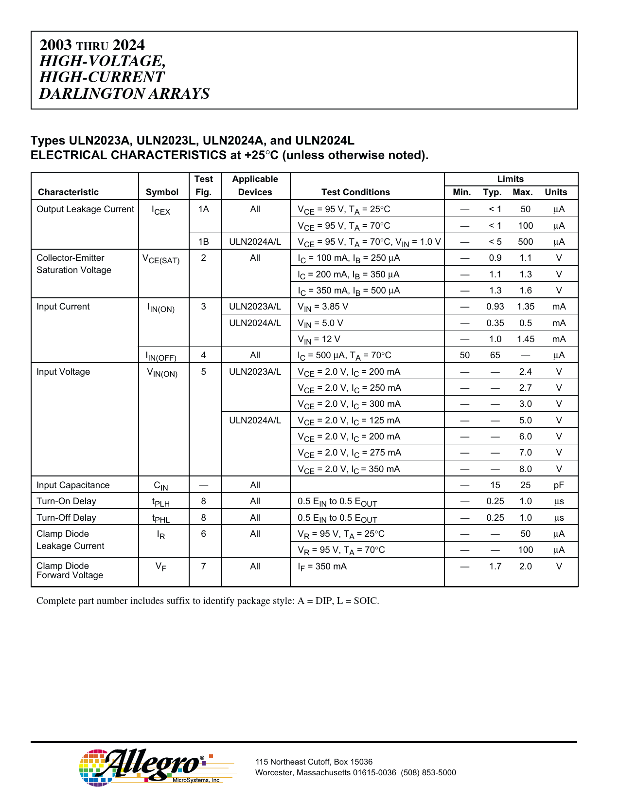 2003 THRU 2024 HIGH-VOLTAGE, HIGH-CURRENT DARLINGTON ARRAYS Types ULN2023A, ULN2023L, ULN2024A, and ULN2024L ELECTRICAL CHARACTERISTICS at +25