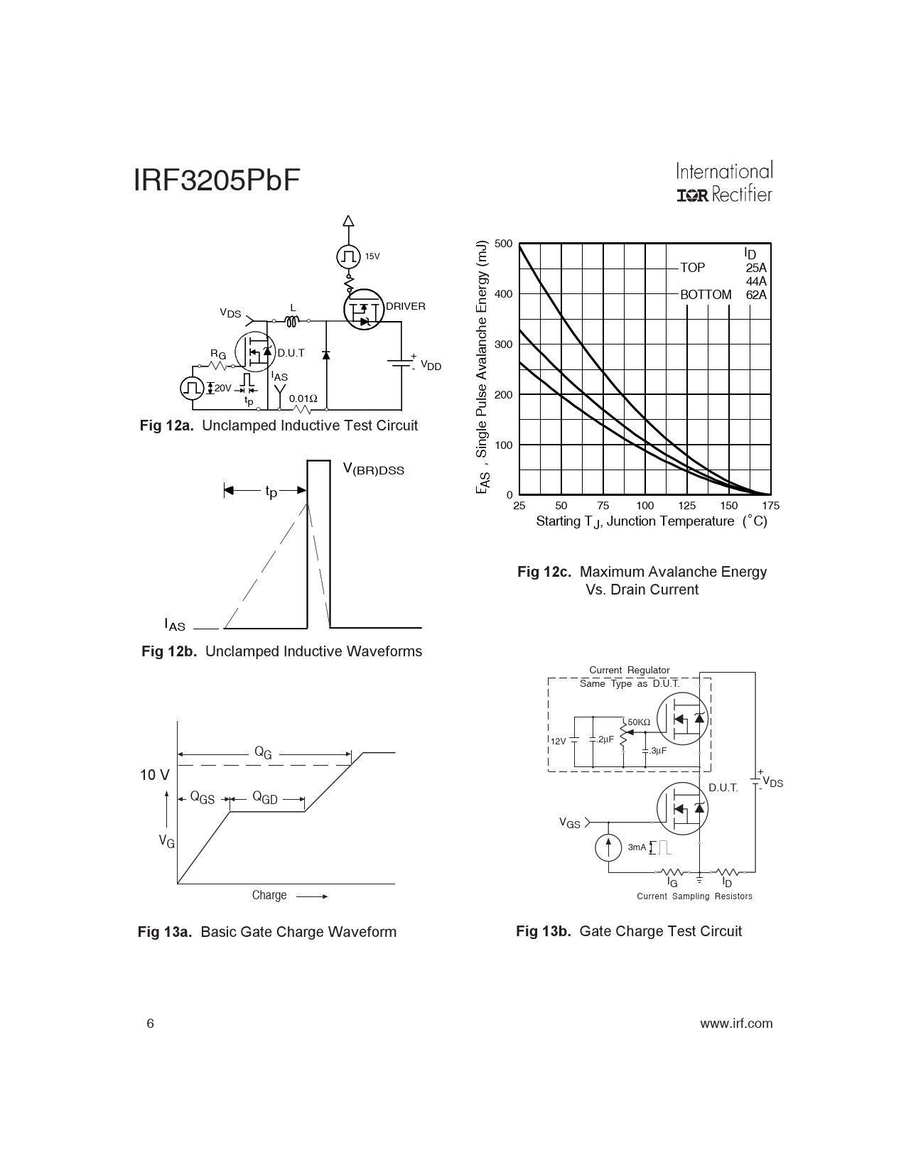 IRF3205PbF 500 J) I 15V m D TOP 25A gy ( 44A 400 ner BOTTOM 62A L DRIVER VDS 300 R anche E G D.U.T + - VDD val IAS A 20V t 0.01 200 p Ω ulse A Fig 12a. Unclamped Inductive Test Circuit e P ingl 100 S V(BR)DSS , t AS p E 025 50 75 100 125 150 175 Starting T , Junction Temperature ( C ° ) J Fig 12c. Maximum Avalanche Energy Vs. Drain Current IAS Fig 12b. Unclamped Inductive Waveforms Current Regulator Same Type as D.U.T. 50KΩ .2µF 12V QG .3µF + 10 V VDS Q D.U.T. - GS QGD VGS VG 3mA I I G D Charge Current Sampling Resistors Fig 13a. Basic Gate Charge Waveform Fig 13b. Gate Charge Test Circuit 6 www.irf.com