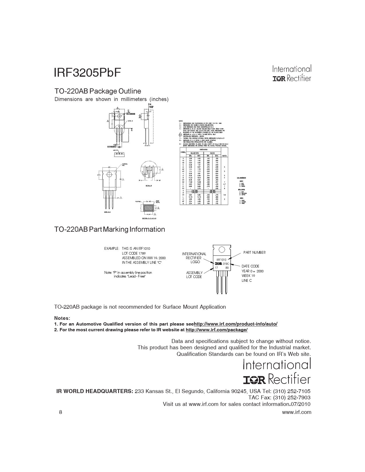 IRF3205PbF TO-220AB Package Outline Dimensions are shown in millimeters (inches) TO-220AB Part Marking Information EXAMPLE: THIS IS AN IRF1010 LOT CODE 1789 INTERNATIONAL PART NUMBER ASSEMBLED ON WW 19, 2000 RECTIFIER IN THE ASSEMBLY LINE "C" LOGO DATE CODE Note: "P" in assembly line position ASSEMBLY YEAR 0 = 2000 indicates "Lead - Free" LOT CODE WEEK 19 LINE C TO-220AB package is not recommended for Surface Mount Application Notes: 1. For an Automotive Qualified version of this part please seehttp://www.irf.com/product-info/auto/ 2. For the most current drawing please refer to IR website at http://www.irf.com/package/ Data and specifications subject to change without notice. This product has been designed and qualified for the Industrial market. Qualification Standards can be found on IR’s Web site. IR WORLD HEADQUARTERS: 233 Kansas St., El Segundo, California 90245, USA Tel: (310) 252-7105 TAC Fax: (310) 252-7903 Visit us at www.irf.com for sales contact information . 07/2010 8 www.irf.com