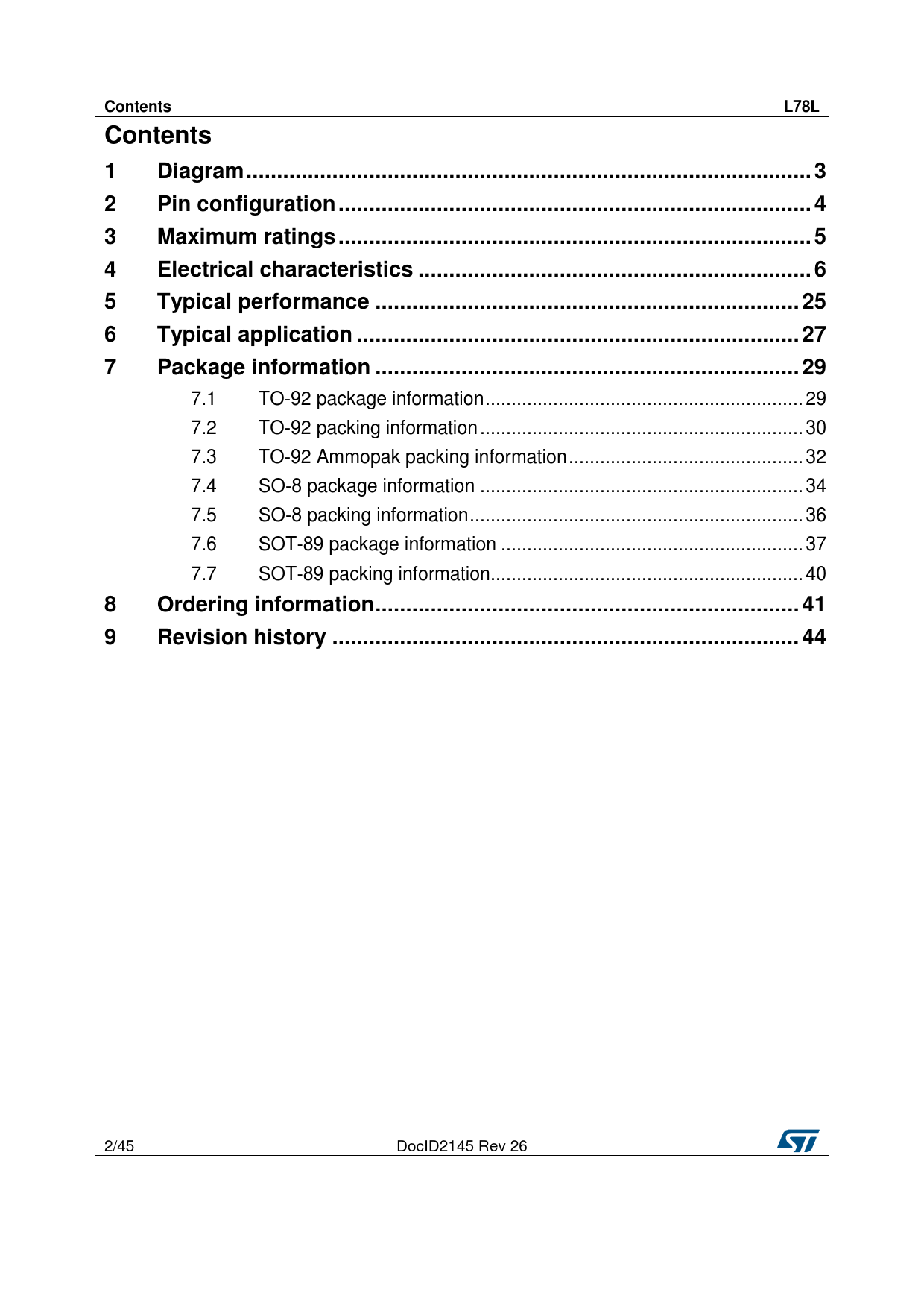 Pages / Page45 / 2 — Contents. L78L. Diagram .. 3. Pin configuration ... 4. Maximum ratings …