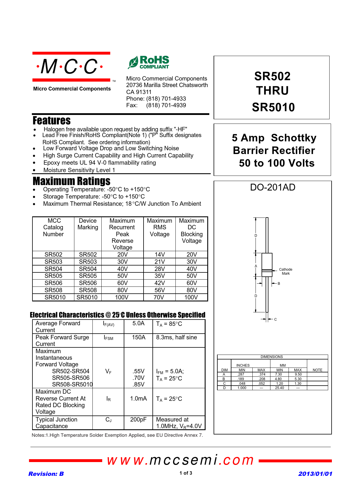 SR502. Micro Commercial Components. THRU. SR5010. 5 Amp Schottky. Barrier Rectifier. 50 to 100 Volts. 1 of 3