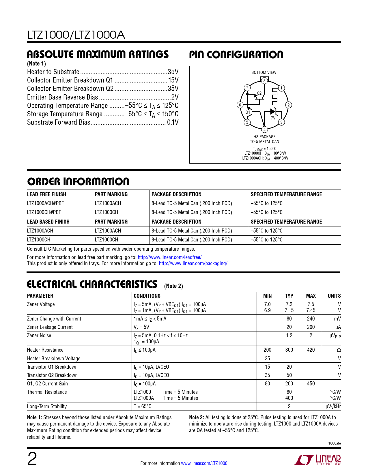 LTZ1000/LTZ1000A absoluTe MaxiMuM raTingspin conFiguraTion(Note 1) Heater to Substrate ...35V BOTTOM VIEW Collector Emitter Breakdown Q1 ...15V 8 Collector Emitter Breakdown Q2 ...35V 7 1 Emitter Base Reverse Bias ..2V Q2 Operating Temperature Range ...–55°C ≤ TA ≤ 125°C 6 2 Storage Temperature Range ..–65°C ≤ TA ≤ 150°C Q1 Substrate Forward Bias .. 0.1V 7V 5 3 4 H8 PACKAGE TO-5 METAL CAN TJMAX = 150°C, LTZ1000CH: θJA = 80°C/W LTZ1000ACH: θJA = 400°C/W orDer inForMaTion LEAD FREE FINISHPART MARKINGPACKAGE DESCRIPTIONSPECIFIED TEMPERATURE RANGE LTZ1000ACH#PBF LTZ1000ACH 8-Lead TO-5 Metal Can (.200 Inch PCD) –55°C to 125°C LTZ1000CH#PBF LTZ1000CH 8-Lead TO-5 Metal Can (.200 Inch PCD) –55°C to 125°C LEAD BASED FINISHPART MARKINGPACKAGE DESCRIPTIONSPECIFIED TEMPERATURE RANGE LTZ1000ACH LTZ1000ACH 8-Lead TO-5 Metal Can (.200 Inch PCD) –55°C to 125°C LTZ1000CH LTZ1000CH 8-Lead TO-5 Metal Can (.200 Inch PCD) –55°C to 125°C Consult LTC Marketing for parts specified with wider operating temperature ranges. For more information on lead free part marking, go to: http://www.linear.com/leadfree/ This product is only offered in trays. For more information go to: http://www.linear.com/packaging/ elecTrical characTerisTics(Note 2) PARAMETERCONDITIONSMINTYPMAXUNITS Zener Voltage lZ = 5mA, (VZ + VBEQ1) IQ1 = 100µA 7.0 7.2 7.5 V lZ = 1mA, (VZ + VBEQ1) IQ1 = 100µA 6.9 7.15 7.45 V Zener Change with Current 1mA ≤ IZ < 5mA 80 240 mV Zener Leakage Current VZ = 5V 20 200 µA Zener Noise lZ = 5mA, 0.1Hz < f < 10Hz 1.2 2 µVP-P 1Q1 = 100µA Heater Resistance IL ≤ 100µA 200 300 420 Ω Heater Breakdown Voltage 35 V Transistor Q1 Breakdown IC = 10µA, LVCEO 15 20 V Transistor Q2 Breakdown IC = 10µA, LVCEO 35 50 V Q1, Q2 Current Gain IC = 100µA 80 200 450 Thermal Resistance LTZ1000 Time = 5 Minutes 80 °C/W LTZ1000A Time = 5 Minutes 400 °C/W Long-Term Stability T = 65°C 2 µV√kHr Note 1: Stresses beyond those listed under Absolute Maximum Ratings Note 2: All testing is done at 25°C. Pulse testing is used for LTZ1000A to may cause permanent damage to the device. Exposure to any Absolute minimize temperature rise during testing. LTZ1000 and LTZ1000A devices Maximum Rating condition for extended periods may affect device are QA tested at –55°C and 125°C. reliability and lifetime. 1000afe 2 For more information www.linear.com/LTZ1000 Document Outline Features Applications Description Typical Application Absolute Maximum Ratings Pin Configuration Order Information Electrical Characteristics Typical Performance Characteristics Pin Functions Block Diagram Applications Information Typical Applications Revision History Package Description Related Parts