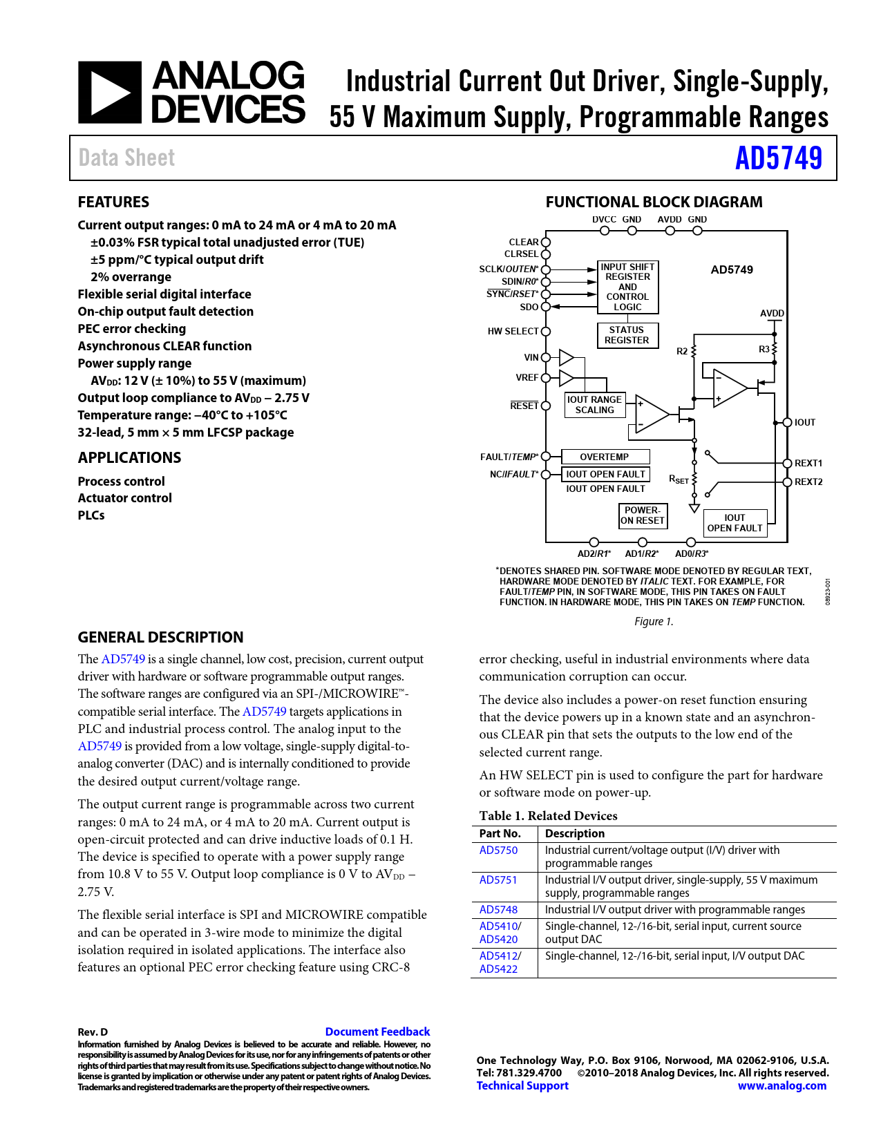 Industrial Current Out Driver, Single-Supply,. 55 V Maximum Supply, Programmable Ranges. Data Sheet. AD5749. FEATURES