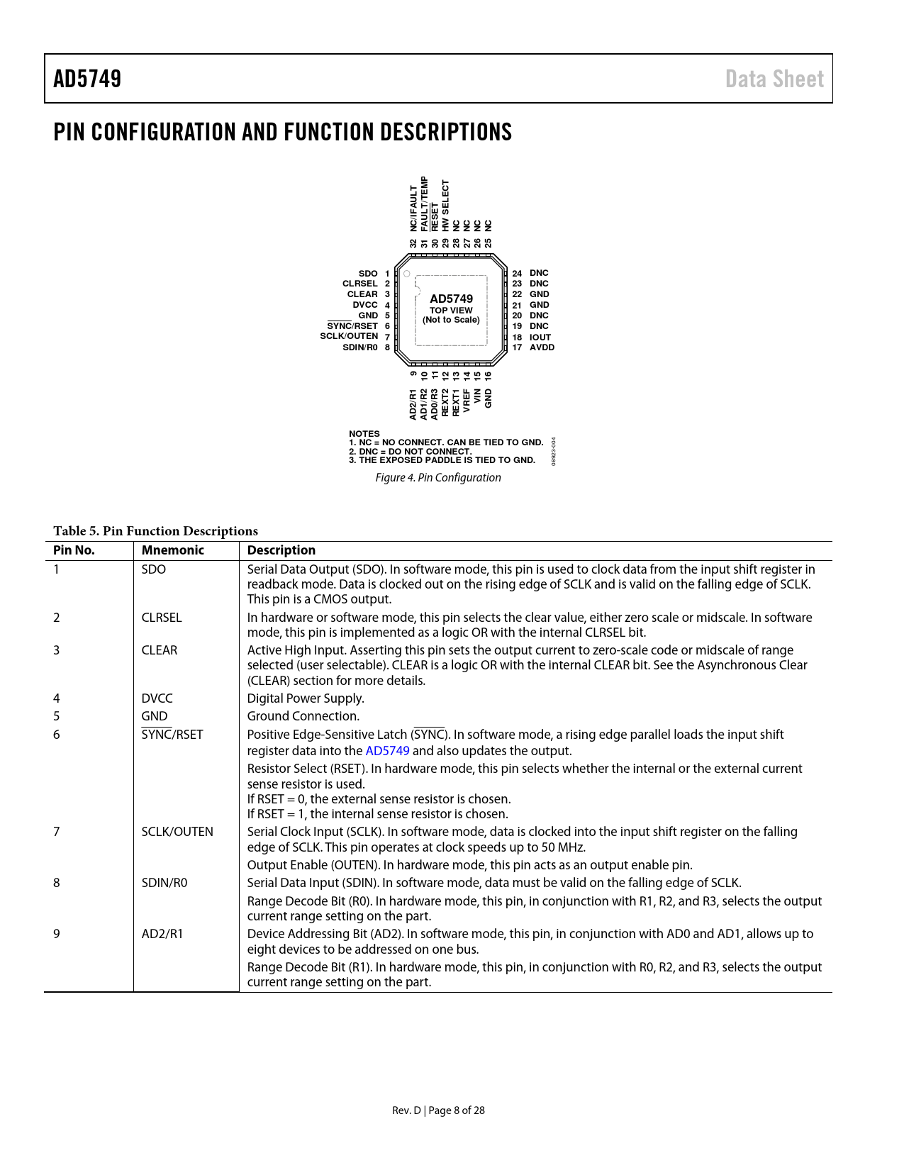 AD5749. Data Sheet. PIN CONFIGURATION AND FUNCTION DESCRIPTIONS. LT/. /IF. SET. SEL. SDO 1. 24 DNC. CLRSEL 2. 23 DNC. CLEAR 3. 22 GND. DVCC 4