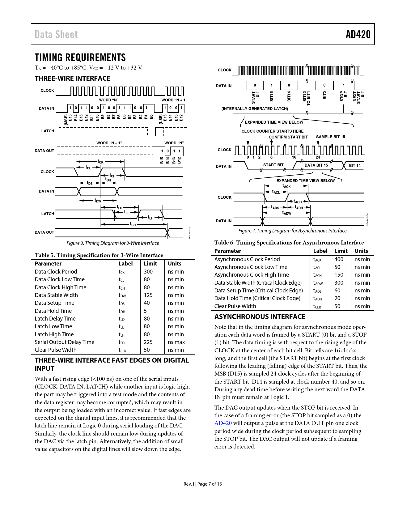 Data SheetAD420TIMING REQUIREMENTS TA = −40°C to +85°C, VCC = +12 V to +32 V. CLOCKTHREE-WIRE INTERFACEDATA IN01001CLOCKTT54310TTTR111ITTOPRABITTTBIEXTBIABIWORD “N”WORD “N + 1”BIBIBIBSTNSTSTTODATA IN101 1 00 10 0 1 1 1 00 1 11 00 1(INTERNALLY GENERATED LATCH)))1BB9B8B7B6B5B4B3B2B1B0B15B14B13B12B1B10SB15B14B13B12(MSB(LEXPANDED TIME VIEW BELOWLATCHCLOCK COUNTER STARTS HERECONFIRM START BITSAMPLE BIT 15WORD “N – 1”WORD “N”DATA OUT1 01 1CLOCK543201281624tCKB1B1B1B1tDATA INSTART BITDATA BIT 15BIT 14CLCLOCKtCHtDHtEXPANDED TIME VIEW BELOWDStACKDATA INtACLCLOCKtDWtACHtLDtADStADHtLATCHLLtADWt 04 LH 0 4- DATA INt 49 SD 00 3 -00 DATA OUT 4 Figure 4. Timing Diagram for Asynchronous Interface 49 00 Figure 3. Timing Diagram for 3-Wire Interface Table 6. Timing Specifications for Asynchronous Interface ParameterLabelLimitUnitsTable 5. Timing Specification for 3-Wire Interface Asynchronous Clock Period tACK 400 ns min ParameterLabelLimitUnits Asynchronous Clock Low Time tACL 50 ns min Data Clock Period tCK 300 ns min Asynchronous Clock High Time tACH 150 ns min Data Clock Low Time tCL 80 ns min Data Stable Width (Critical Clock Edge) tADW 300 ns min Data Clock High Time tCH 80 ns min Data Setup Time (Critical Clock Edge) tADS 60 ns min Data Stable Width tDW 125 ns min Data Hold Time (Critical Clock Edge) tADH 20 ns min Data Setup Time tDS 40 ns min Clear Pulse Width tCLR 50 ns min Data Hold Time tDH 5 ns min Latch Delay Time t ASYNCHRONOUS INTERFACE LD 80 ns min Latch Low Time tLL 80 ns min Note that in the timing diagram for asynchronous mode oper- Latch High Time tLH 80 ns min ation each data word is framed by a START (0) bit and a STOP Serial Output Delay Time tSD 225 ns max (1) bit. The data timing is with respect to the rising edge of the Clear Pulse Width tCLR 50 ns min CLOCK at the center of each bit cell. Bit cells are 16 clocks THREE-WIRE INTERFACE FAST EDGES ON DIGITAL long, and the first cell (the START bit) begins at the first clock INPUT following the leading (falling) edge of the START bit. Thus, the MSB (D15) is sampled 24 clock cycles after the beginning of With a fast rising edge (<100 ns) on one of the serial inputs the START bit, D14 is sampled at clock number 40, and so on. (CLOCK, DATA IN, LATCH) while another input is logic high, During any dead time before writing the next word the DATA the part may be triggered into a test mode and the contents of IN pin must remain at Logic 1. the data register may become corrupted, which may result in the output being loaded with an incorrect value. If fast edges are The DAC output updates when the STOP bit is received. In expected on the digital input lines, it is recommended that the the case of a framing error (the STOP bit sampled as a 0) the latch line remain at Logic 0 during serial loading of the DAC. AD420 will output a pulse at the DATA OUT pin one clock Similarly, the clock line should remain low during updates of period wide during the clock period subsequent to sampling the DAC via the latch pin. Alternatively, the addition of small the STOP bit. The DAC output will not update if a framing value capacitors on the digital lines will slow down the edge. error is detected. Rev. I | Page 7 of 16 Document Outline FEATURES FUNCTIONAL BLOCK DIAGRAM GENERAL DESCRIPTION PRODUCT HIGHLIGHTS TABLE OF CONTENTS REVISION HISTORY SPECIFICATIONS ABSOLUTE MAXIMUM RATINGS ESD CAUTION PIN CONFIGURATION AND FUNCTION DESCRIPTIONS TIMING REQUIREMENTS THREE-WIRE INTERFACE THREE-WIRE INTERFACE FAST EDGES ON DIGITAL INPUT ASYNCHRONOUS INTERFACE TERMINOLOGY THEORY OF OPERATION APPLICATIONS INFORMATION CURRENT OUTPUT DRIVING INDUCTIVE LOADS VOLTAGE-MODE OUTPUT OPTIONAL SPAN AND ZERO TRIM THREE-WIRE INTERFACE USING MULTIPLE DACS WITH FAULT DETECT ASYNCHRONOUS INTERFACE USING OPTOCOUPLERS MICROPROCESSOR INTERFACE AD420-TO-MC68HC11 (SPI BUS) INTERFACE AD420 TO MICROWIRE INTERFACE EXTERNAL BOOST FUNCTION AD420 PROTECTION TRANSIENT VOLTAGE PROTECTION BOARD LAYOUT AND GROUNDING POWER SUPPLIES AND DECOUPLING OUTLINE DIMENSIONS ORDERING GUIDE