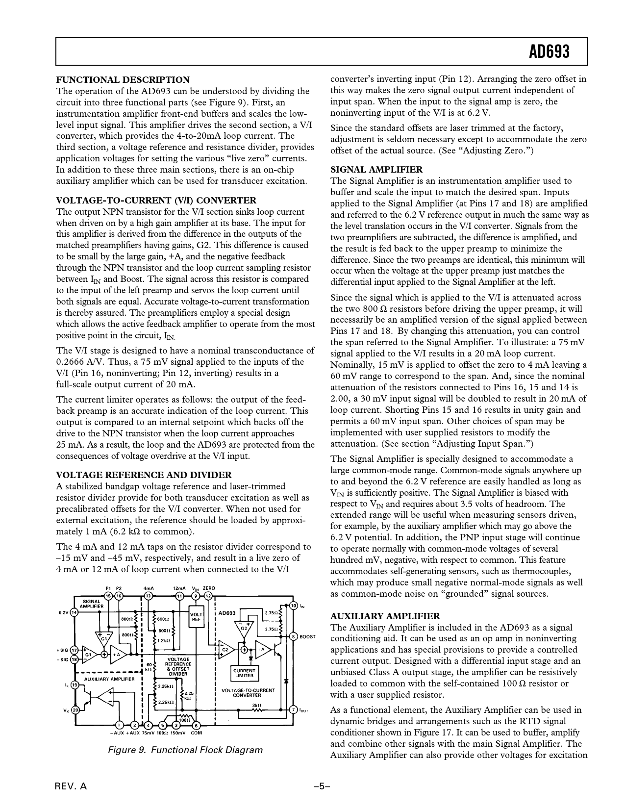 AD693FUNCTIONAL DESCRIPTION converter’s inverting input (Pin 12). Arranging the zero offset in The operation of the AD693 can be understood by dividing the this way makes the zero signal output current independent of circuit into three functional parts (see Figure 9). First, an input span. When the input to the signal amp is zero, the instrumentation amplifier front-end buffers and scales the low- noninverting input of the V/I is at 6.2 V. level input signal. This amplifier drives the second section, a V/I Since the standard offsets are laser trimmed at the factory, converter, which provides the 4-to-20mA loop current. The adjustment is seldom necessary except to accommodate the zero third section, a voltage reference and resistance divider, provides offset of the actual source. (See “Adjusting Zero.”) application voltages for setting the various “live zero” currents. In addition to these three main sections, there is an on-chip SIGNAL AMPLIFIER auxiliary amplifier which can be used for transducer excitation. The Signal Amplifier is an instrumentation amplifier used to buffer and scale the input to match the desired span. Inputs VOLTAGE-TO-CURRENT (V/I) CONVERTER applied to the Signal Amplifier (at Pins 17 and 18) are amplified The output NPN transistor for the V/I section sinks loop current and referred to the 6.2 V reference output in much the same way as when driven on by a high gain amplifier at its base. The input for the level translation occurs in the V/I converter. Signals from the this amplifier is derived from the difference in the outputs of the two preamplifiers are subtracted, the difference is amplified, and matched preamplifiers having gains, G2. This difference is caused the result is fed back to the upper preamp to minimize the to be small by the large gain, +A, and the negative feedback difference. Since the two preamps are identical, this minimum will through the NPN transistor and the loop current sampling resistor occur when the voltage at the upper preamp just matches the between IIN and Boost. The signal across this resistor is compared differential input applied to the Signal Amplifier at the left. to the input of the left preamp and servos the loop current until Since the signal which is applied to the V/I is attenuated across both signals are equal. Accurate voltage-to-current transformation the two 800 Ω resistors before driving the upper preamp, it will is thereby assured. The preamplifiers employ a special design necessarily be an amplified version of the signal applied between which allows the active feedback amplifier to operate from the most Pins 17 and 18. By changing this attenuation, you can control positive point in the circuit, IIN. the span referred to the Signal Amplifier. To illustrate: a 75 mV The V/I stage is designed to have a nominal transconductance of signal applied to the V/I results in a 20 mA loop current. 0.2666 A/V. Thus, a 75 mV signal applied to the inputs of the Nominally, 15 mV is applied to offset the zero to 4 mA leaving a V/I (Pin 16, noninverting; Pin 12, inverting) results in a 60 mV range to correspond to the span. And, since the nominal full-scale output current of 20 mA. attenuation of the resistors connected to Pins 16, 15 and 14 is The current limiter operates as follows: the output of the feed- 2.00, a 30 mV input signal will be doubled to result in 20 mA of back preamp is an accurate indication of the loop current. This loop current. Shorting Pins 15 and 16 results in unity gain and output is compared to an internal setpoint which backs off the permits a 60 mV input span. Other choices of span may be drive to the NPN transistor when the loop current approaches implemented with user supplied resistors to modify the 25 mA. As a result, the loop and the AD693 are protected from the attenuation. (See section “Adjusting Input Span.”) consequences of voltage overdrive at the V/I input. The Signal Amplifier is specially designed to accommodate a large common-mode range. Common-mode signals anywhere up VOLTAGE REFERENCE AND DIVIDER to and beyond the 6.2 V reference are easily handled as long as A stabilized bandgap voltage reference and laser-trimmed VIN is sufficiently positive. The Signal Amplifier is biased with resistor divider provide for both transducer excitation as well as respect to VIN and requires about 3.5 volts of headroom. The precalibrated offsets for the V/I converter. When not used for extended range will be useful when measuring sensors driven, external excitation, the reference should be loaded by approxi- for example, by the auxiliary amplifier which may go above the mately 1 mA (6.2 kΩ to common). 6.2 V potential. In addition, the PNP input stage will continue The 4 mA and 12 mA taps on the resistor divider correspond to to operate normally with common-mode voltages of several –15 mV and –45 mV, respectively, and result in a live zero of hundred mV, negative, with respect to common. This feature 4 mA or 12 mA of loop current when connected to the V/I accommodates self-generating sensors, such as thermocouples, which may produce small negative normal-mode signals as well as common-mode noise on “grounded” signal sources. AUXILIARY AMPLIFIER The Auxiliary Amplifier is included in the AD693 as a signal conditioning aid. It can be used as an op amp in noninverting applications and has special provisions to provide a controlled current output. Designed with a differential input stage and an unbiased Class A output stage, the amplifier can be resistively loaded to common with the self-contained 100 Ω resistor or with a user supplied resistor. As a functional element, the Auxiliary Amplifier can be used in dynamic bridges and arrangements such as the RTD signal conditioner shown in Figure 17. It can be used to buffer, amplify and combine other signals with the main Signal Amplifier. The Figure 9. Functional Flock Diagram Auxiliary Amplifier can also provide other voltages for excitation REV.
