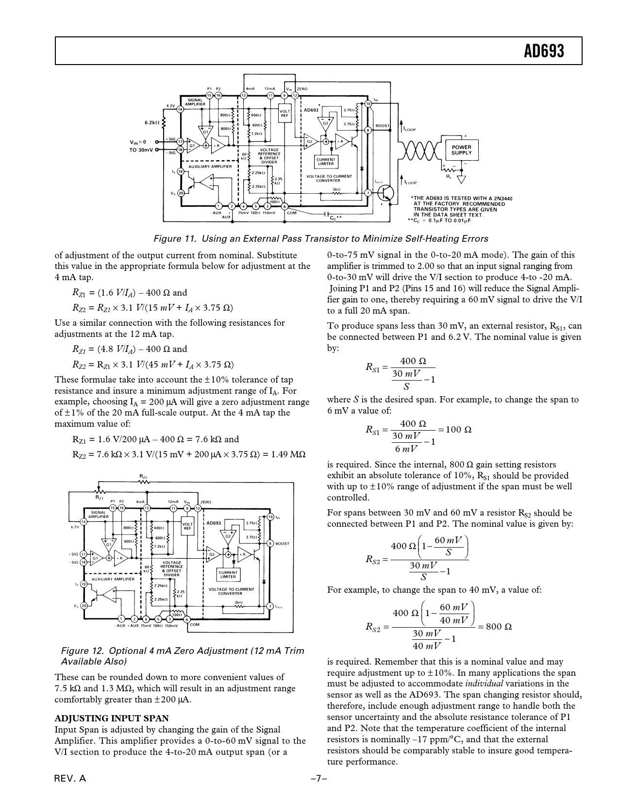 AD693 Figure 11. Using an External Pass Transistor to Minimize Self-Heating Errors of adjustment of the output current from nominal. Substitute 0-to-75 mV signal in the 0-to-20 mA mode). The gain of this this value in the appropriate formula below for adjustment at the amplifier is trimmed to 2.00 so that an input signal ranging from 4 mA tap. 0-to-30 mV will drive the V/I section to produce 4-to -20 mA. R Joining P1 and P2 (Pins 15 and 16) will reduce the Signal Ampli- Z1 = (1.6 V/IA) – 400 Ω and fier gain to one, thereby requiring a 60 mV signal to drive the V/I RZ2 = RZ1 × 3.1 V/(15 mV + IA × 3.75 Ω) to a full 20 mA span. Use a similar connection with the following resistances for To produce spans less than 30 mV, an external resistor, RS1, can adjustments at the 12 mA tap. be connected between P1 and 6.2 V. The nominal value is given R by: Z1 = (4.8 V/IA) – 400 Ω and RZ2 = RZ1 × 3.1 V/(45 mV + IA × 3.75 Ω) R = 400 Ω S1 30 mV These formulae take into account the ± 10% tolerance of tap −1 resistance and insure a minimum adjustment range of I S A. For example, choosing I where S is the desired span. For example, to change the span to A = 200 µA will give a zero adjustment range of ± 1% of the 20 mA full-scale output. At the 4 mA tap the 6 mV a value of: maximum value of: R = 400 Ω = 100 Ω S1 R 30 mV Z1 = 1.6 V/200 µA – 400 Ω = 7.6 kΩ and −1 6 mV R Z2 = 7.6 kΩ × 3.1 V/(15 mV + 200 µA × 3.75 Ω) = 1.49 MΩ is required. Since the internal, 800 Ω gain setting resistors exhibit an absolute tolerance of 10%, RS1 should be provided with up to ± 10% range of adjustment if the span must be well controlled. For spans between 30 mV and 60 mV a resistor RS2 should be connected between P1 and P2. The nominal value is given by: 400 Ω 1− 60 mV S R = S2 30 mV −1 S For example, to change the span to 40 mV, a value of: 400 Ω 1 − 60 mV 40 mV R = = 800 Ω S2 30 mV −1 40 mV Figure 12. Optional 4 mA Zero Adjustment (12 mA Trim Available Also) is required. Remember that this is a nominal value and may require adjustment up to ± 10%. In many applications the span These can be rounded down to more convenient values of must be adjusted to accommodate individual variations in the 7.5 kΩ and 1.3 MΩ, which will result in an adjustment range sensor as well as the AD693. The span changing resistor should, comfortably greater than ± 200 µA. therefore, include enough adjustment range to handle both the ADJUSTING INPUT SPAN sensor uncertainty and the absolute resistance tolerance of P1 Input Span is adjusted by changing the gain of the Signal and P2. Note that the temperature coefficient of the internal Amplifier. This amplifier provides a 0-to-60 mV signal to the resistors is nominally –17 ppm/°C, and that the external V/I section to produce the 4-to-20 mA output span (or a resistors should be comparably stable to insure good tempera- ture performance. REV. A –7–
