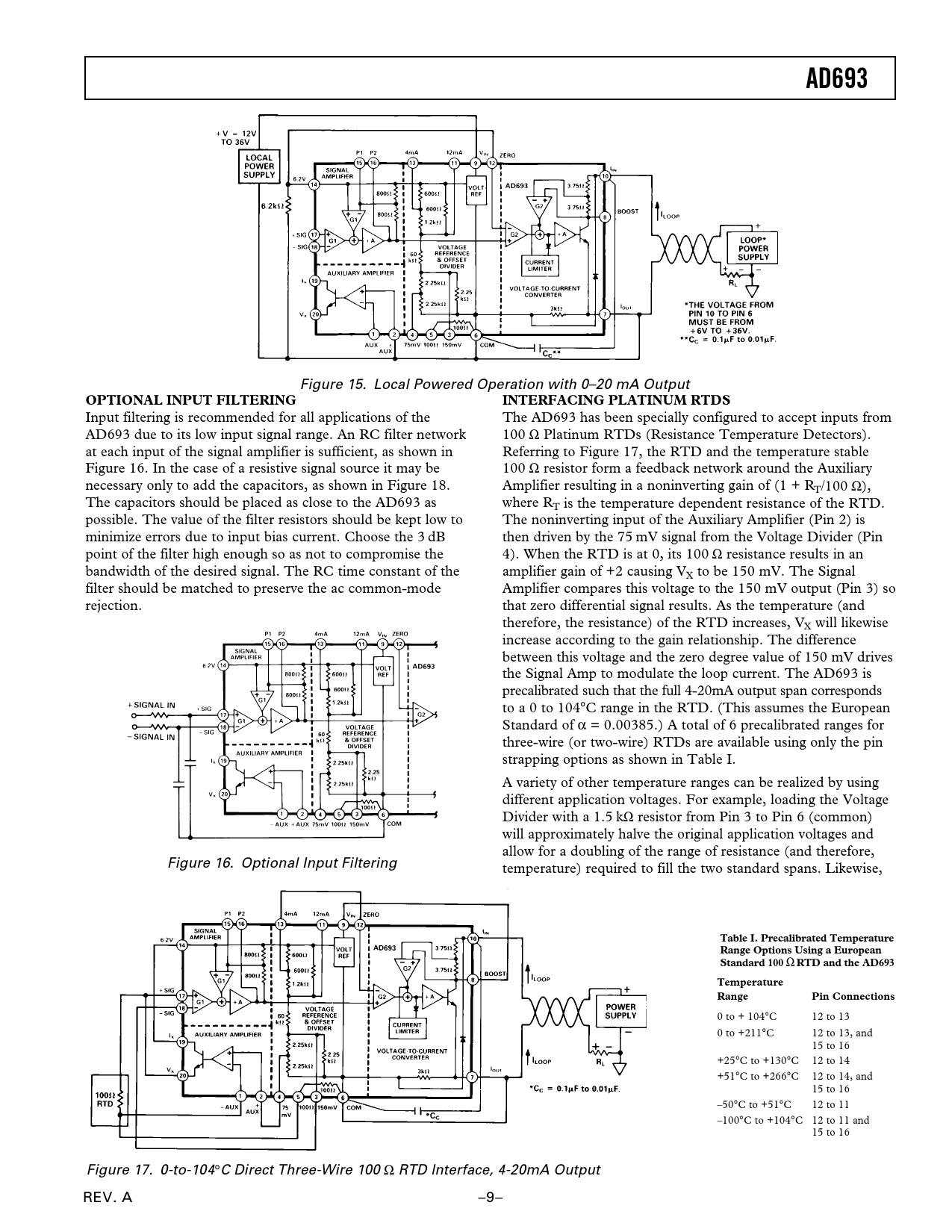 AD693 Figure 15. Local Powered Operation with 0–20 mA Output OPTIONAL INPUT FILTERINGINTERFACING PLATINUM RTDS Input filtering is recommended for all applications of the The AD693 has been specially configured to accept inputs from AD693 due to its low input signal range. An RC filter network 100 Ω Platinum RTDs (Resistance Temperature Detectors). at each input of the signal amplifier is sufficient, as shown in Referring to Figure 17, the RTD and the temperature stable Figure 16. In the case of a resistive signal source it may be 100 Ω resistor form a feedback network around the Auxiliary necessary only to add the capacitors, as shown in Figure 18. Amplifier resulting in a noninverting gain of (1 + RT/100 Ω), The capacitors should be placed as close to the AD693 as where RT is the temperature dependent resistance of the RTD. possible. The value of the filter resistors should be kept low to The noninverting input of the Auxiliary Amplifier (Pin 2) is minimize errors due to input bias current. Choose the 3 dB then driven by the 75 mV signal from the Voltage Divider (Pin point of the filter high enough so as not to compromise the 4). When the RTD is at 0, its 100 Ω resistance results in an bandwidth of the desired signal. The RC time constant of the amplifier gain of +2 causing VX to be 150 mV. The Signal filter should be matched to preserve the ac common-mode Amplifier compares this voltage to the 150 mV output (Pin 3) so rejection. that zero differential signal results. As the temperature (and therefore, the resistance) of the RTD increases, VX will likewise increase according to the gain relationship. The difference between this voltage and the zero degree value of 150 mV drives the Signal Amp to modulate the loop current. The AD693 is precalibrated such that the full 4-20mA output span corresponds to a 0 to 104°C range in the RTD. (This assumes the European Standard of α = 0.00385.) A total of 6 precalibrated ranges for three-wire (or two-wire) RTDs are available using only the pin strapping options as shown in Table I. A variety of other temperature ranges can be realized by using different application voltages. For example, loading the Voltage Divider with a 1.5 kΩ resistor from Pin 3 to Pin 6 (common) will approximately halve the original application voltages and allow for a doubling of the range of resistance (and therefore, Figure 16. Optional Input Filtering temperature) required to fill the two standard spans. Likewise, Table I. Precalibrated Temperature Range Options Using a European Standard 100 Ω RTD and the AD693Temperature RangePin Connections 0 to + 104°C 12 to 13 0 to +211°C 12 to 13, and 15 to 16 +25°C to +130°C 12 to 14 +51°C to +266°C 12 to 14, and 15 to 16 –50°C to +51°C 12 to 11 –100°C to +104°C 12 to 11 and 15 to 16 Figure 17. 0-to-104°C Direct Three-Wire 100 Ω RTD lnterface, 4-20mA Output REV. A –9–