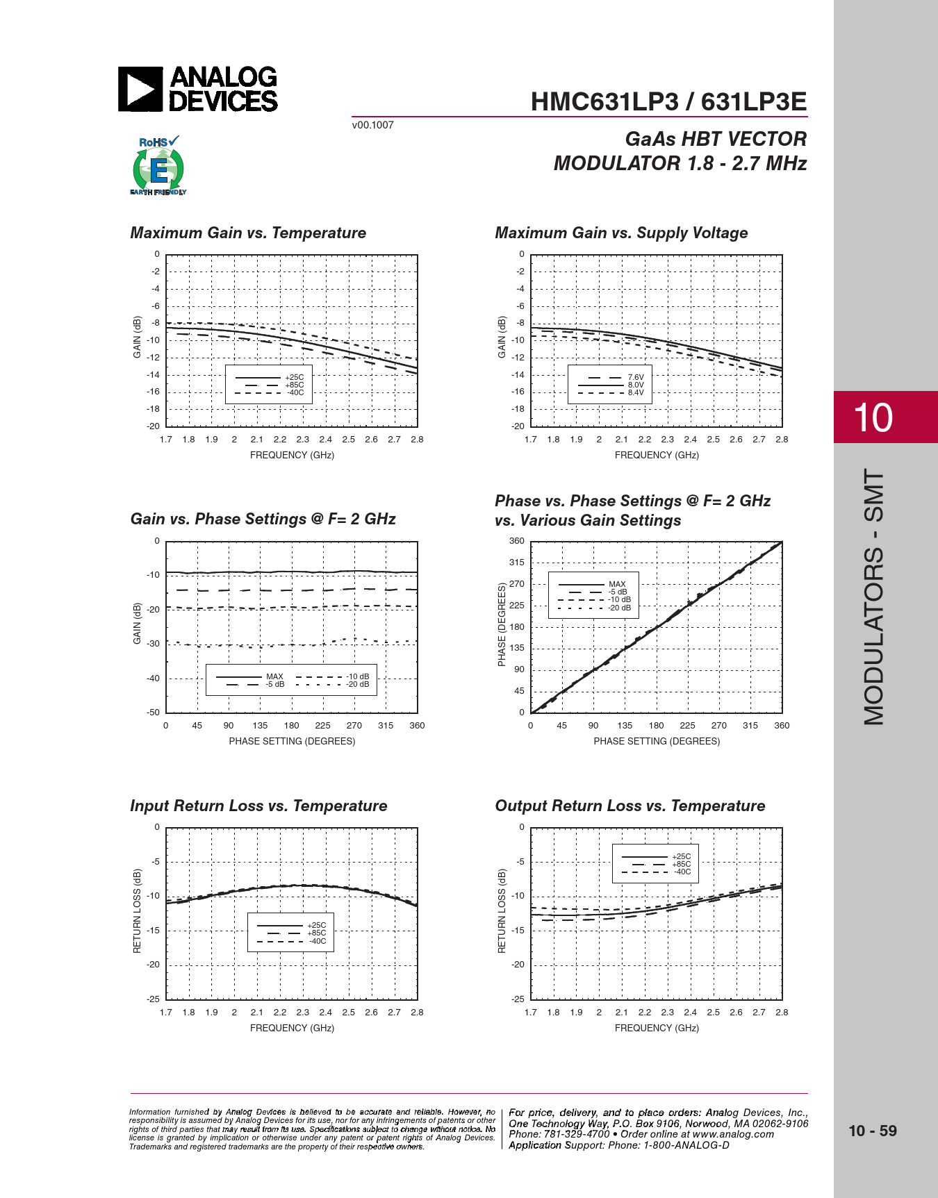 HMC631LP3 / 631LP3E GaAs HBT VECTOR MODULATOR 1.8 - 2.7 MHz Maximum Gain vs Temperature Maximum Gain vs Supply Voltage