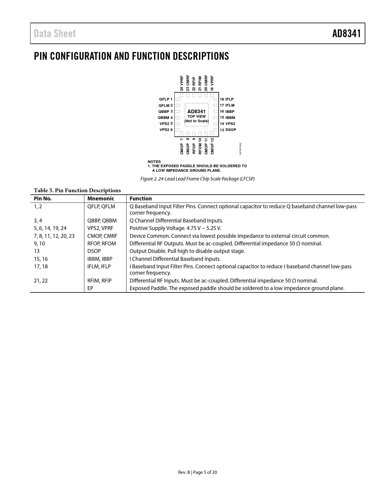 | Pages / Page | 20 / 5 — Data Sheet. AD8341. PIN CONFIGURATION AND FUNCTION DESCRIPTIONS. FIP. … |