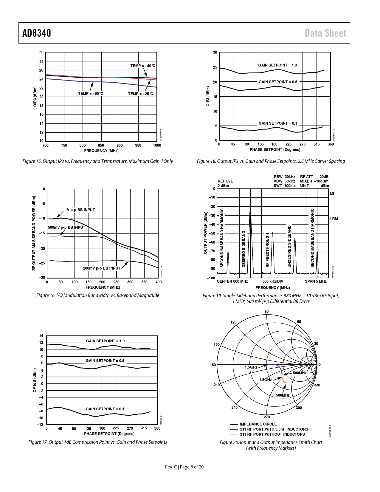 Figure 16. I/Q Modulation Bandwidth vs. Baseband Magnitude Figure 19. Single-Sideband Performance, 880 MHz, −10 dBm RF Input; 1 MHz, 500 mV p-p Differential BB Drive