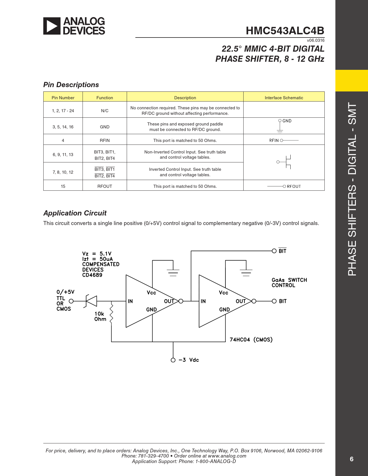 HMC543ALC4B v06.0316 22.5° MMIC 4-BIT DIGITALPHASE SHIFTER, 8 - 12 GHzPin Descriptions Pin Number Function Description Interface Schematic No connection required. These pins may be connected to T 1, 2, 17 - 24 N/C RF/DC ground without affecting performance. M These pins and exposed ground paddle 3, 5, 14, 16 GND must be connected to RF/DC ground. 4 RFIN This port is matched to 50 Ohms. L - S BIT3, BIT1, Non-Inverted Control Input. See truth table 6, 9, 11, 13 ITA BIT2, BIT4 and control voltage tables. IG BIT3, BIT1 Inverted Control Input. See truth table 7, 8, 10, 12 BIT2, BIT4 and control voltage tables. 15 RFOUT This port is matched to 50 Ohms. S - D R E Application Circuit T IF This circuit converts a single line positive (0/+5V) control signal to complementary negative (0/-3V) control signals. H E S S A H P For price, delivery, and to place orders: Analog Devices, Inc., One Technology Way, P.O. Box 9106, Norwood, MA 02062-9106 Phone: 781-329-4700 • Order online at www.analog.com Application Support: Phone: 1-800-ANALOG-D 6