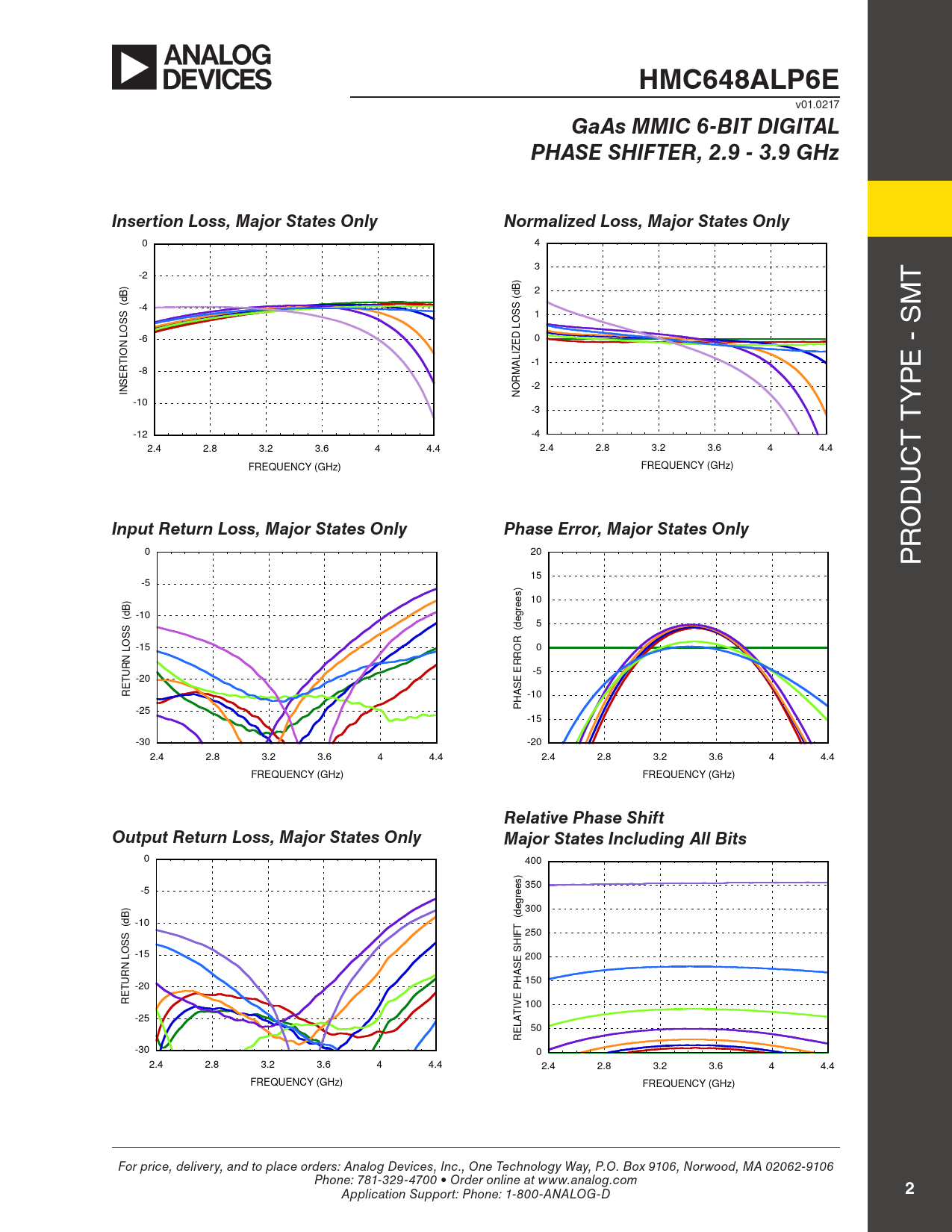 HMC648ALP6E v01.0217 GaAs MMIC 6-BIT DIGITALPHASE SHIFTER, 2.9 - 3.9 GHzInsertion Loss, Major States OnlyNormalized Loss, Major States Only 0 4 3 -2 t ) B) B 2 d (d ( -4 M S SS 1 S O O L L -6 0 N ED IO IZ T AL -1 R e - S -8 E M S R O -2 P IN N -10 y -3 t -12 -4 2.4 2.8 3.2 3.6 4 4.4 t 2.4 2.8 3.2 3.6 4 4.4 FREQUENCY (GHz) FREQUENCY (GHz) c u d o Input Return Loss, Major States OnlyPhase Error, Major States Only r 0 20 P 15 -5 ) 10 B ees -10 (d 5 S S (degr O R L -15 O 0 N R R UR E -5 T -20 E S RE A -10 H -25 P -15 -30 -20 2.4 2.8 3.2 3.6 4 4.4 2.4 2.8 3.2 3.6 4 4.4 FREQUENCY (GHz) FREQUENCY (GHz) Relative Phase ShiftOutput Return Loss, Major States OnlyMajor States Including All Bits 0 400 ) s e 350 -5 re g ) e 300 B -10 (d (d T S 250 IF S O SH L -15 200 N ASE UR 150 T -20 PH RE IVE 100 -25 AT 50 EL R -30 0 2.4 2.8 3.2 3.6 4 4.4 2.4 2.8 3.2 3.6 4 4.4 FREQUENCY (GHz) FREQUENCY (GHz) For price, delivery, and to place orders: Analog Devices, Inc., One Technology Way, P.O. Box 9106, Norwood, MA 02062-9106 Phone: 781-329-4700 • Order online at www.analog.com Application Support: Phone: 1-800-ANALOG-D 2