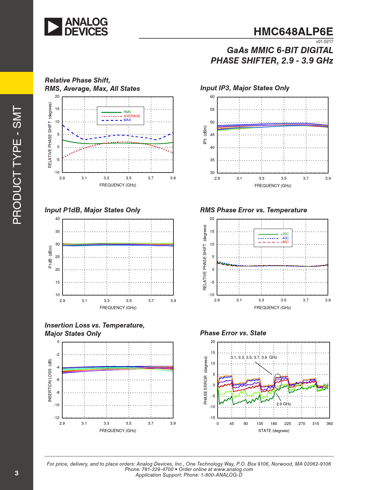 HMC648ALP6E. GaAs MMIC 6-BIT DIGITAL. PHASE SHIFTER, 2.9 - 3.9 GHz. Relative Phase Shift, RMS, Average, Max, All States