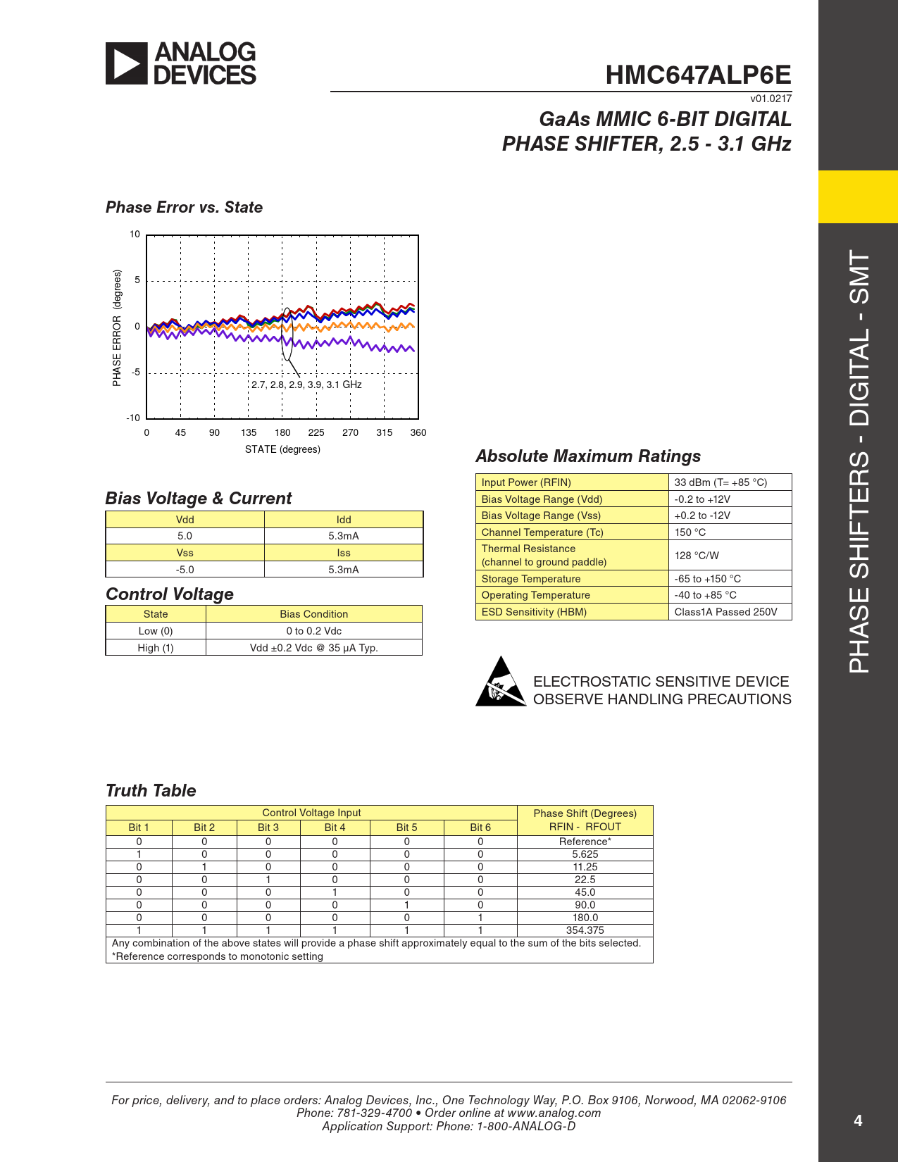 HMC647ALP6E GaAs MMIC 6-BIT DIGITAL PHASE SHIFTER, 2.5 - 3.1 GHz Phase Error vs State Absolute Maximum Ratings